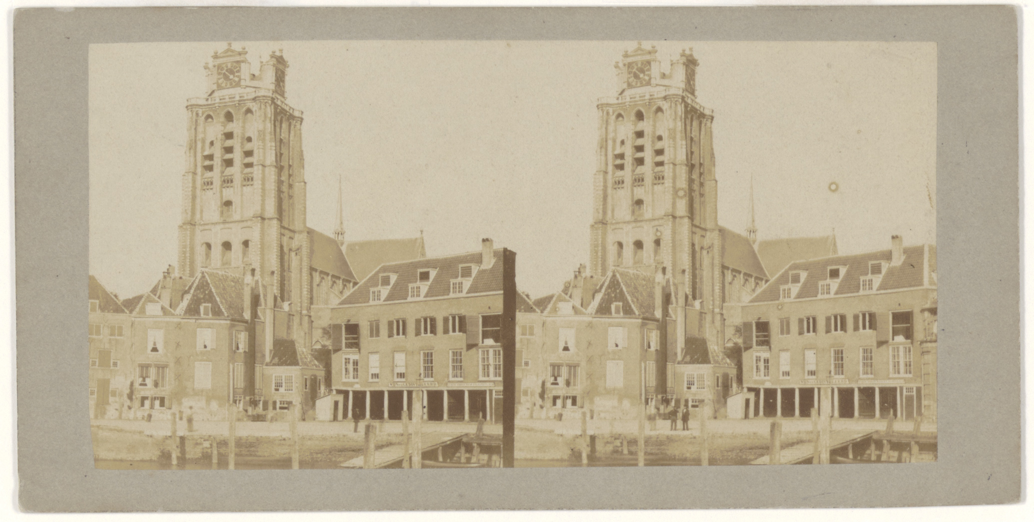 Stereofoto van de Bomhaven richting Korte Geldersekade en Grote Kerk. Rechts de eerste …