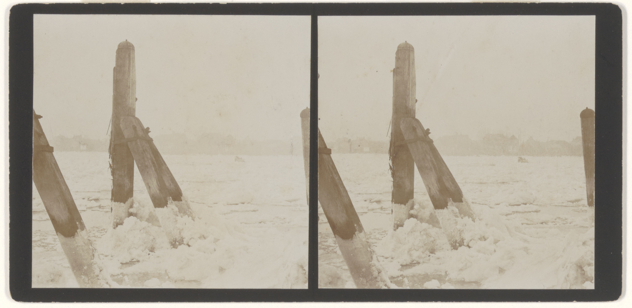 Stereofoto van de dichtgevroren Oude Maas vanaf de Zwijndrechtse oever ter hoogte van …
