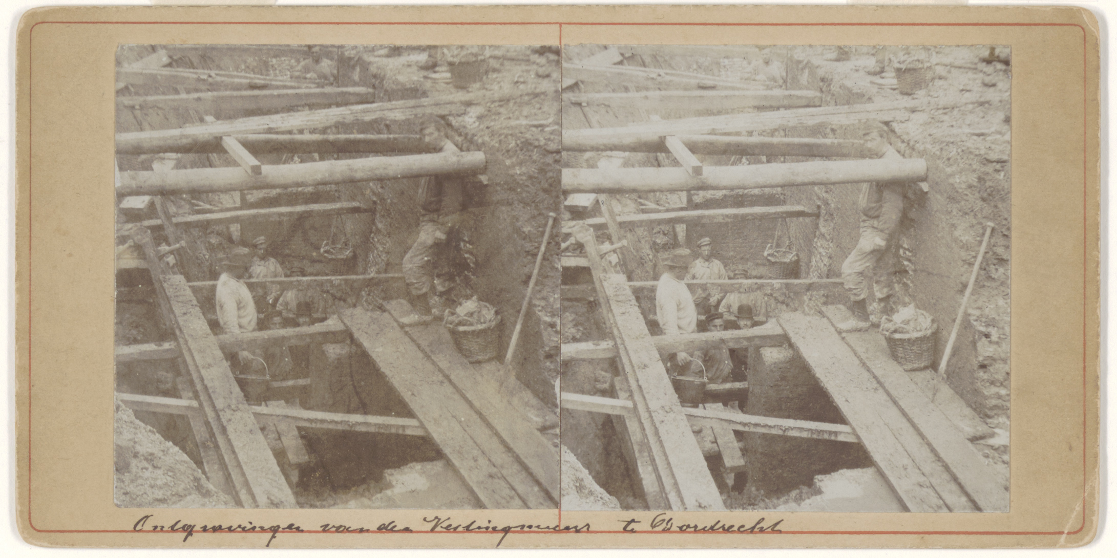 - Stereofoto van de opgraving van een vestingmuur; locatie onbekend.