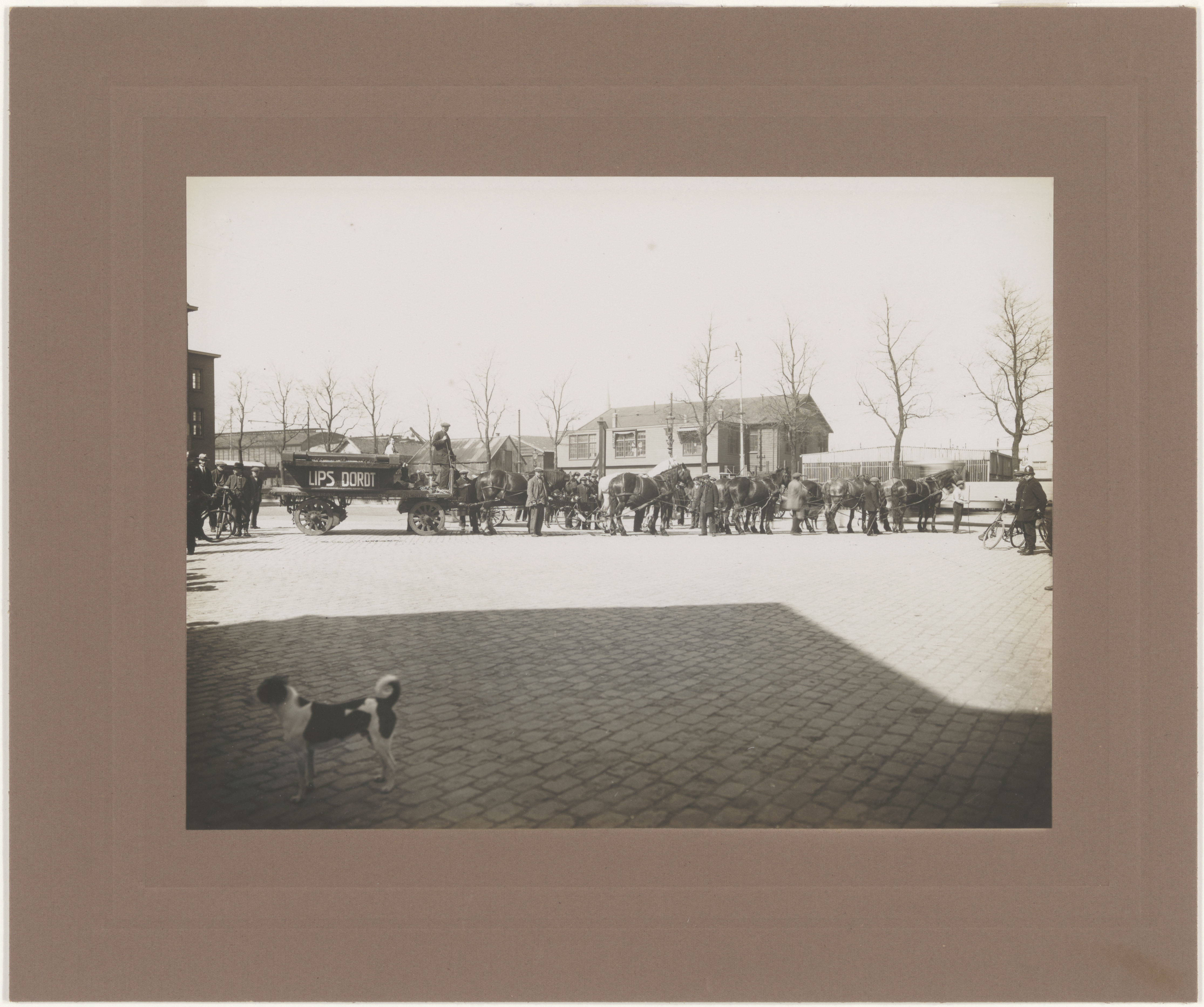 Zie ik daar linksboven het dak van het gebouwtje in het midden een spitstorentje? J. Lips Bzn., 23 jaar, afkomstig uit Rotterdam begon met een halfwas knechtje en leerjongen in de Botgensstraat [1870], hij had hier de zaak overgenomen van de smid Van Den Boom die zijn smidse had in de Botgensstraat D383. Lips had het vak bij zijn vader geleerd die in Rotterdam zijn naam reeds gevestigd had als vervaardiger van brandkasten en kluisdeuren. Hij schroefde zijn naamplaatje ook nog op de volgende adressen: Groenmarkt 9 [1883] (zijn zoon kwam in de zaak), Varkenmarkt 9rd [1895] hier werd geïnvesteerd in speciale machines voor de vervaardiging van brandkasten , Spuiweg 89 [1899] (zijn schoonzoon Eras kwam in de zaak en in 1907 zijn 2e zoon). In 1903 werd een apart bedrijf opgericht voor veiligheidssloten. Het totaal oppervlak aan bedrijfsgebouwen bestaat nu uit 5400 M². Begin 1912 een nieuwe uitbreiding (slotenfabriek) op de hoek Spuiweg/Burg. de Raadtsingel. De gemeente maakte er een punt van dat Lips zijn elektriciteit van de Gem.Elec.Centrale zou betrekken ipv een eigen walmende petroleum installatie. Lips kon bedingen dat de gemeente voor de klinkerbestrating van de slotenfabriek tot aan de Spuiweg zou zorgen. Het zou kunnen dat we nu op deze foto naar die klinkers kijken, maar ik geloof het niet. [1919] Merwedestraat. Ik denk dat het ergens onderweg is tijdens het transport van een kluisdeur naar een klant of het magazijn op de Varkenmarkt. Het valt me op dat de lading niet is afgedekt met een zeil. Of dit is de plaats van vertrek en het zeil moet er nog op. Of er wordt hier overgeladen op een ander transportmiddel (trein?). Of de plaats van bestemming is bereikt. Of de koetsier/menner had net buienradar gecheckt en dacht dat het wel zonder kon. ;)