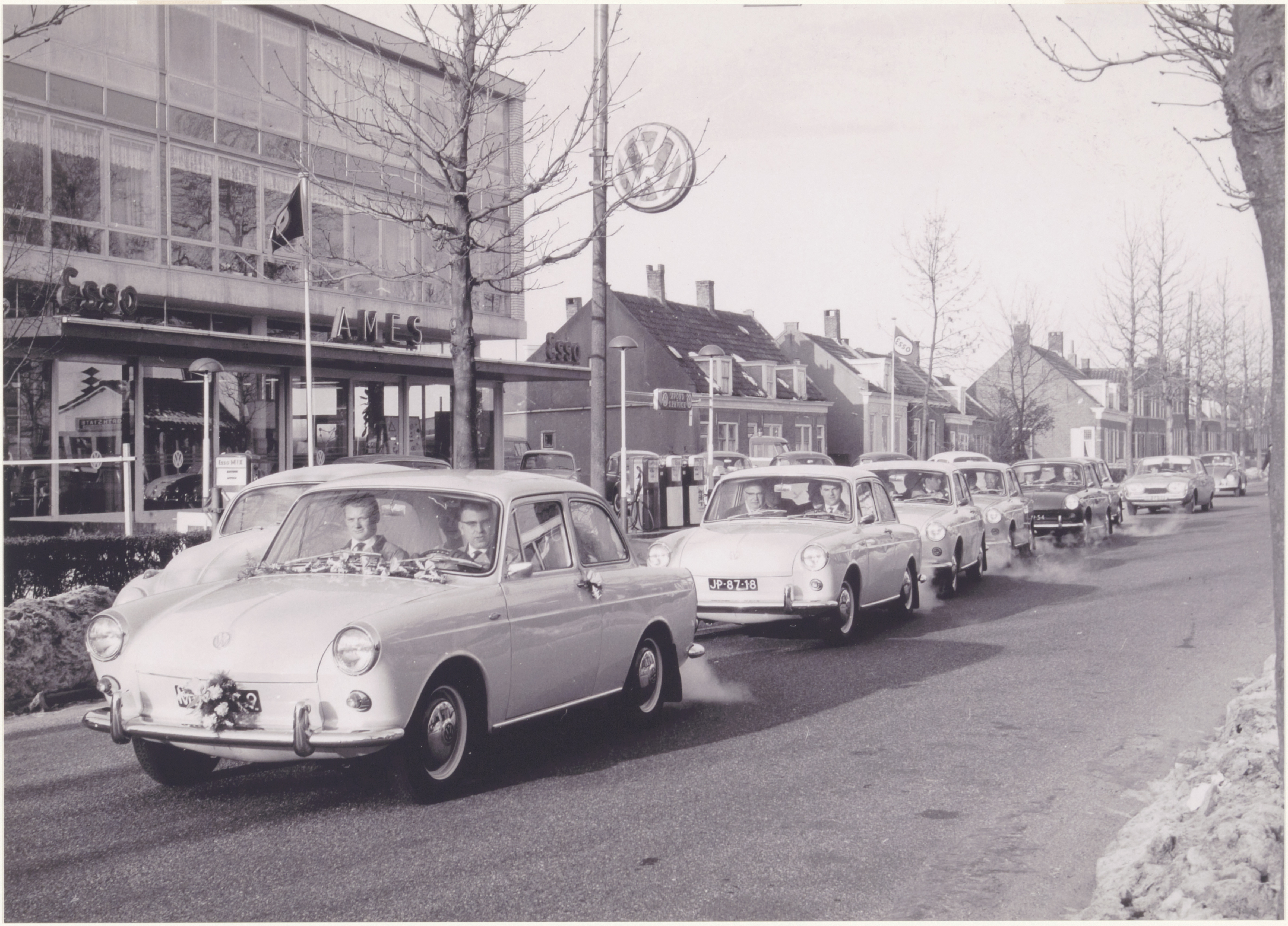 Optocht van Volkswagens op de Stationsweg in Sliedrecht tijdens de opening van een Ames-garage.