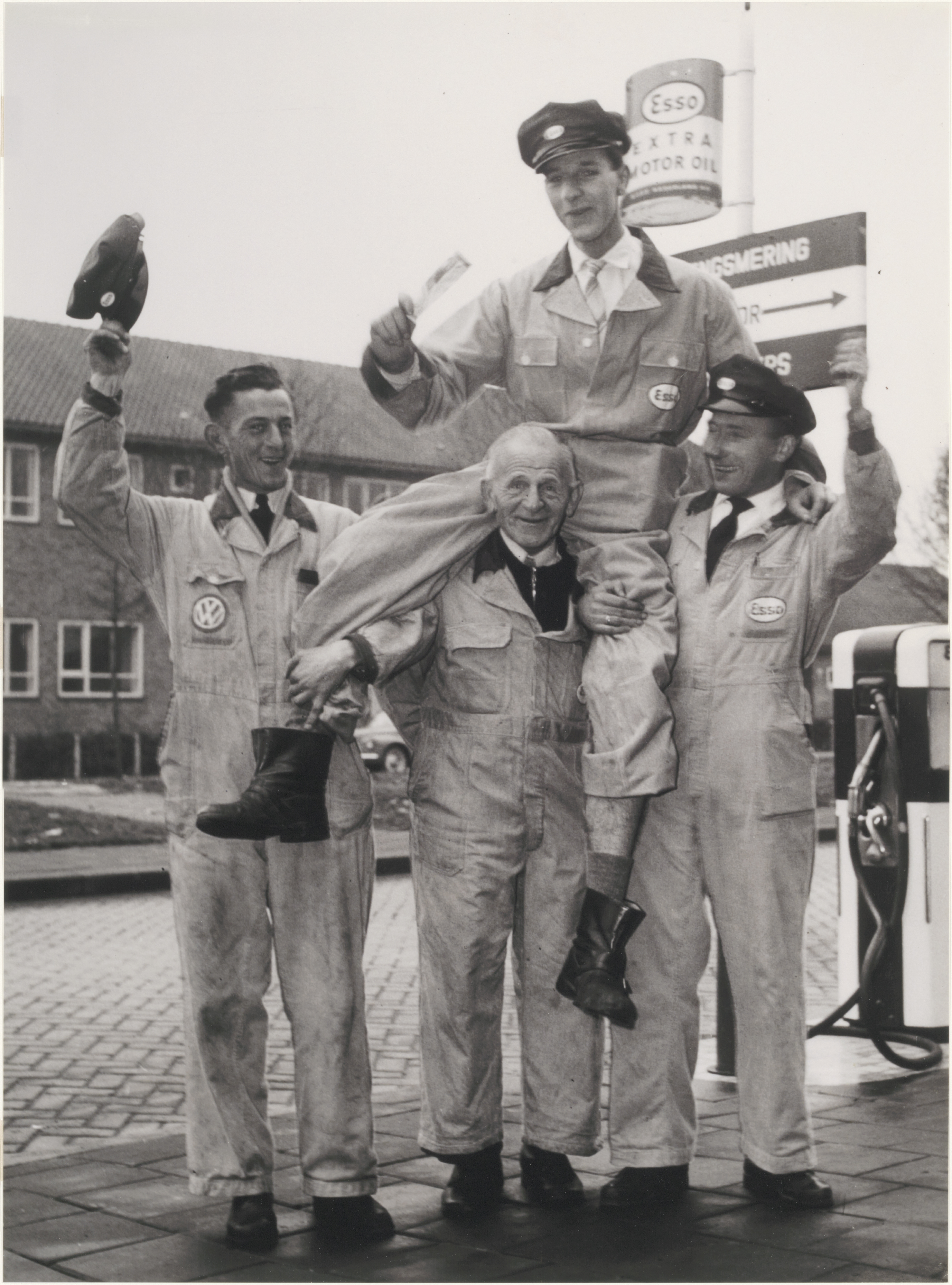 - Personeel van garage Ames aan de Brouwersdijk. De man op de schouders is Herman Bestenbreur.