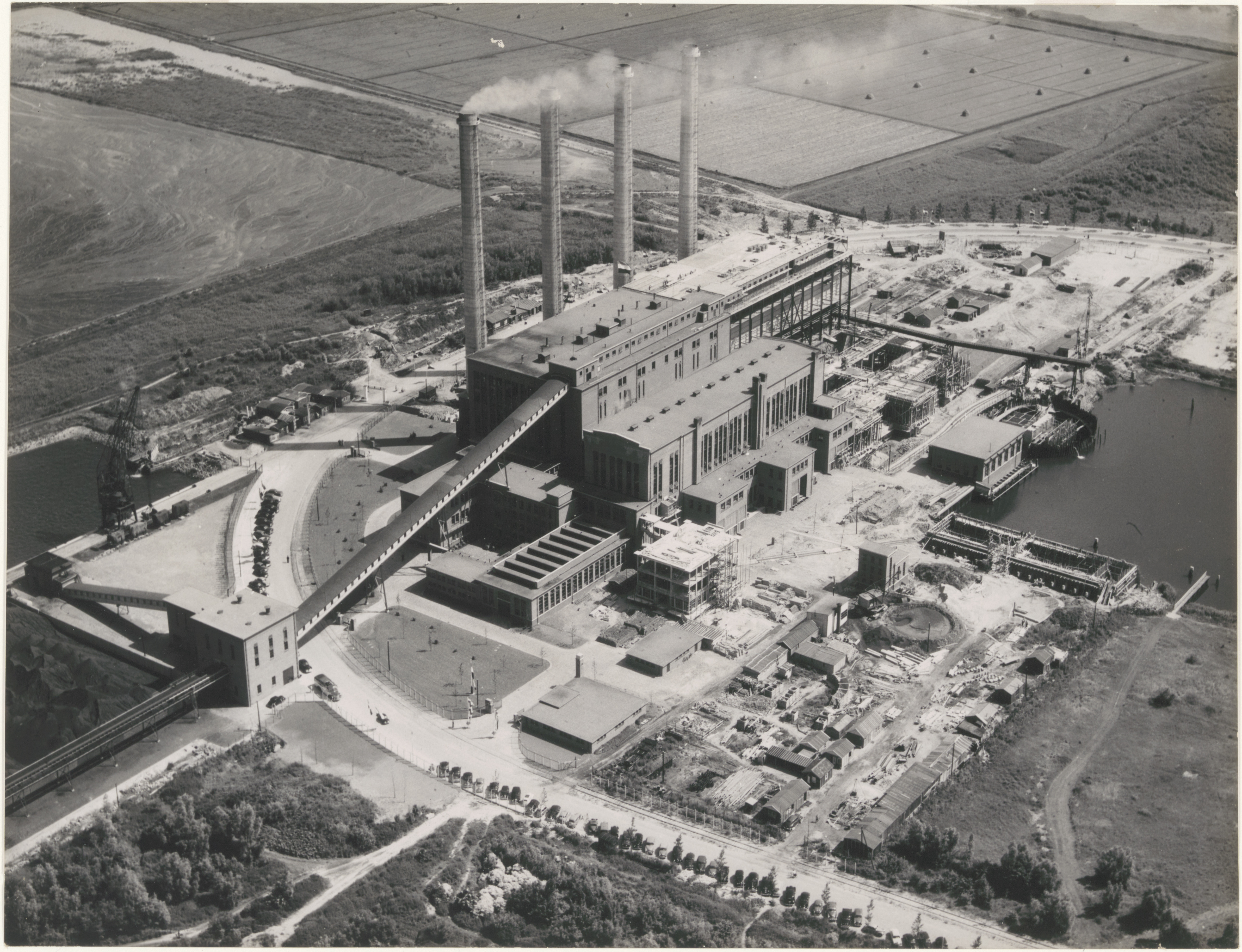 Rechts de Eerste Merwedehaven te zien en hieruit betrok de fabriek het koelwater om de afgewerkte stoom na de turbines gepasseerd te zijn neer te slaan. Links de kolenhaven waarin het koelwater weer geloosd werd. Het kolenpark bood plaats aan totaal 80.000 ton steenkool; voor de CM 1 en 2 elk 40.000 ton. De kolentransportband die liep tussen het brekergebouw en de fabriek was ruim 100 m lang.