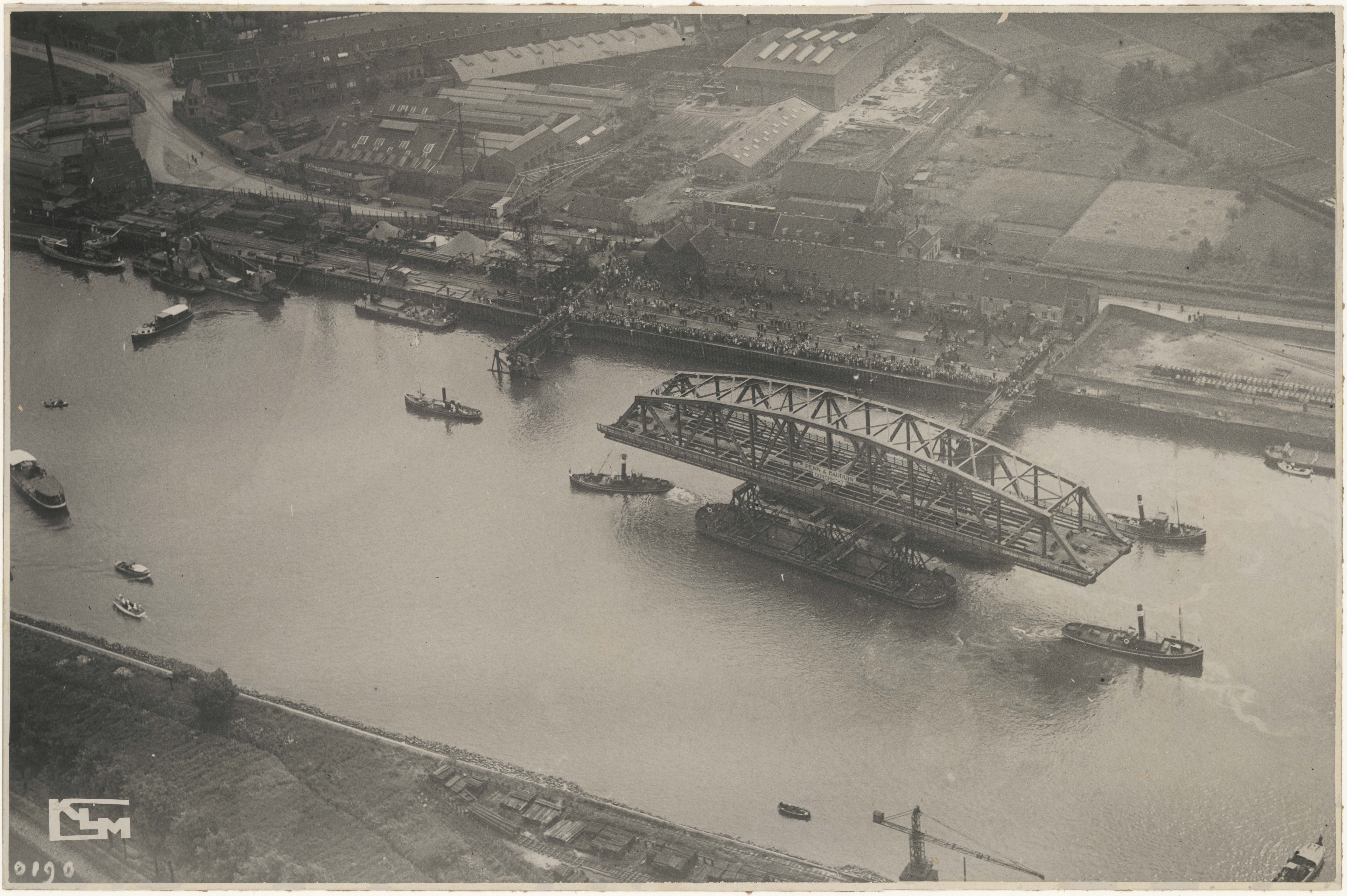 - bruggenbouw luchtfoto's pontons stoomsleepboten