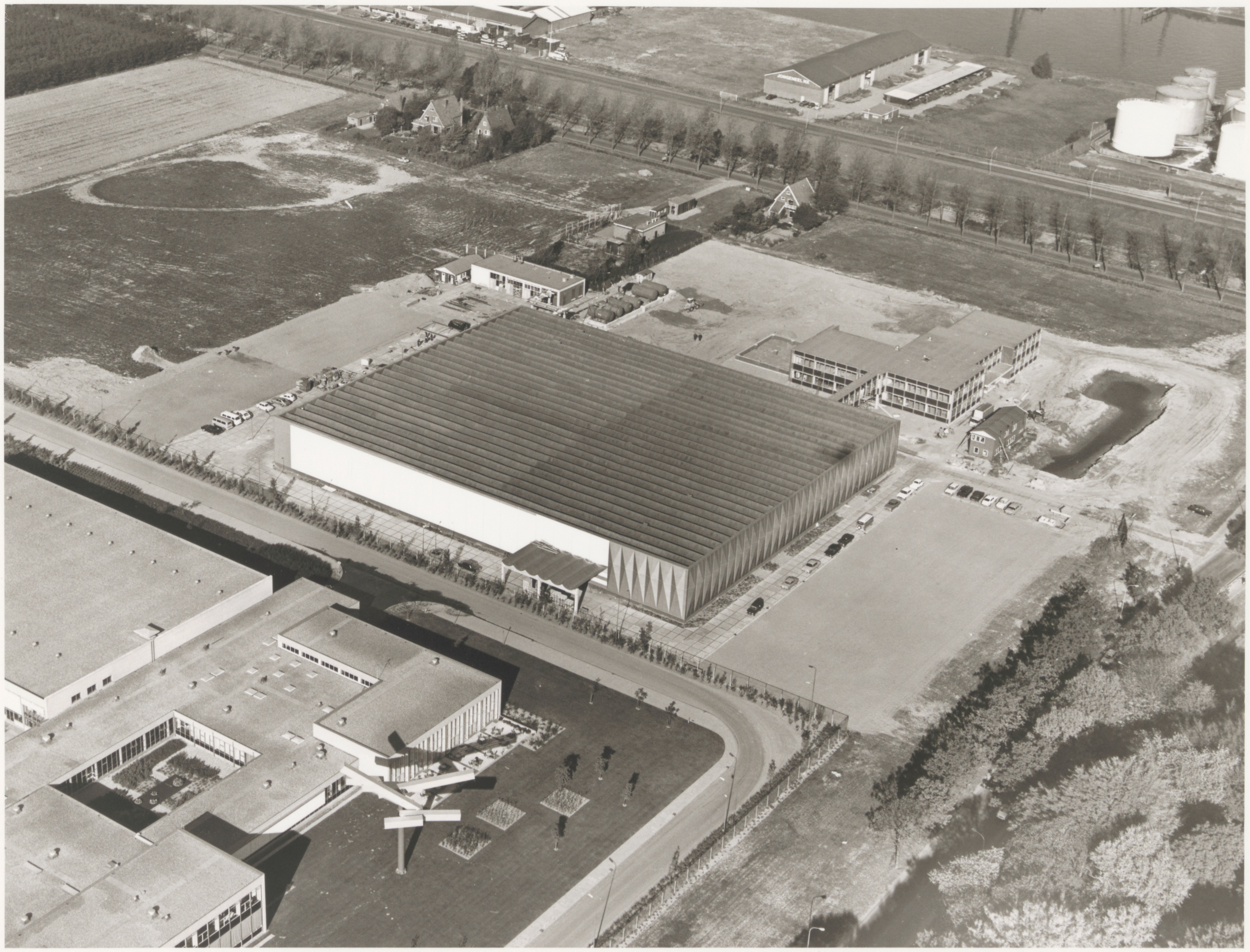 - Luchtfoto met linksonder de sociale werkplaats DSW, daarboven de Zwartkop-fabriek op de hoek van de Rijksstraatweg en de Amstelwijckweg (boven).