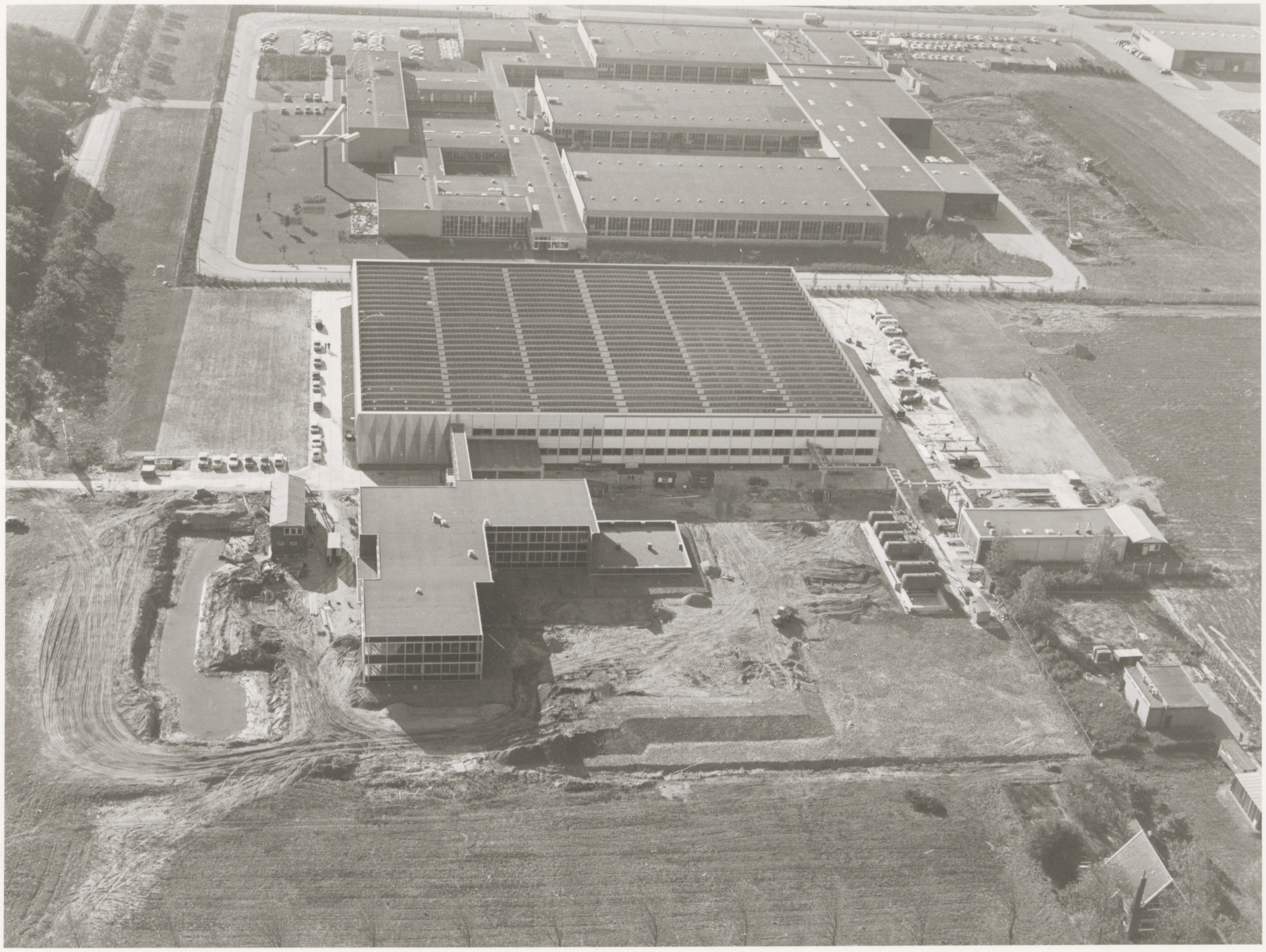 - Luchtfoto van de Zwartkop-fabriek en daarboven de sociale werkplaats DSW aan de Rijksstraatweg, gezien naar het zuiden.