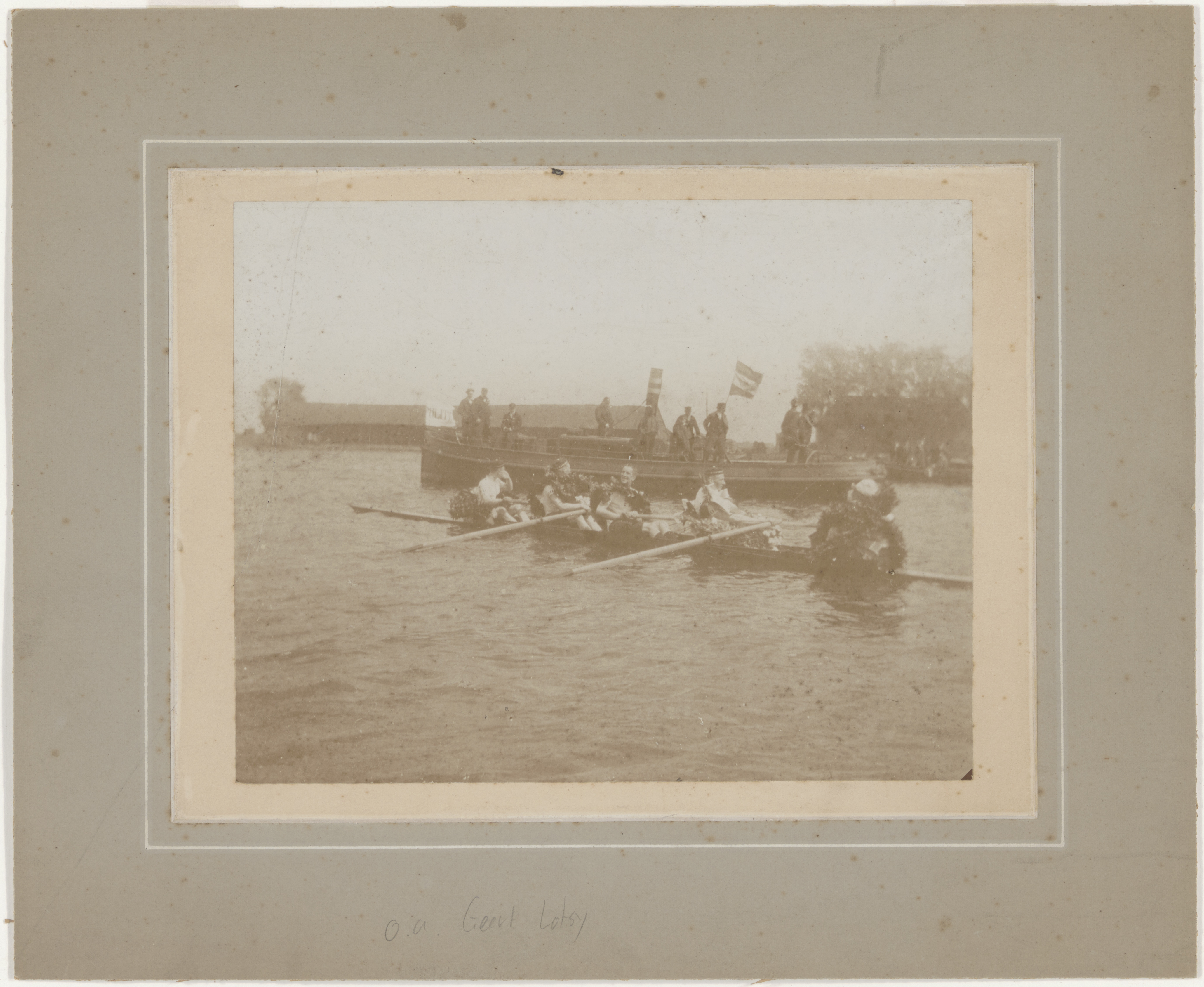 - Roeiploeg met o.a. de zilveren medaillewinnaar op de Olympische Spelen van 1900 in Parijs Geert Lotsy op het Galgewater in Leiden voor het botenhuis van roeivereniging Njord.