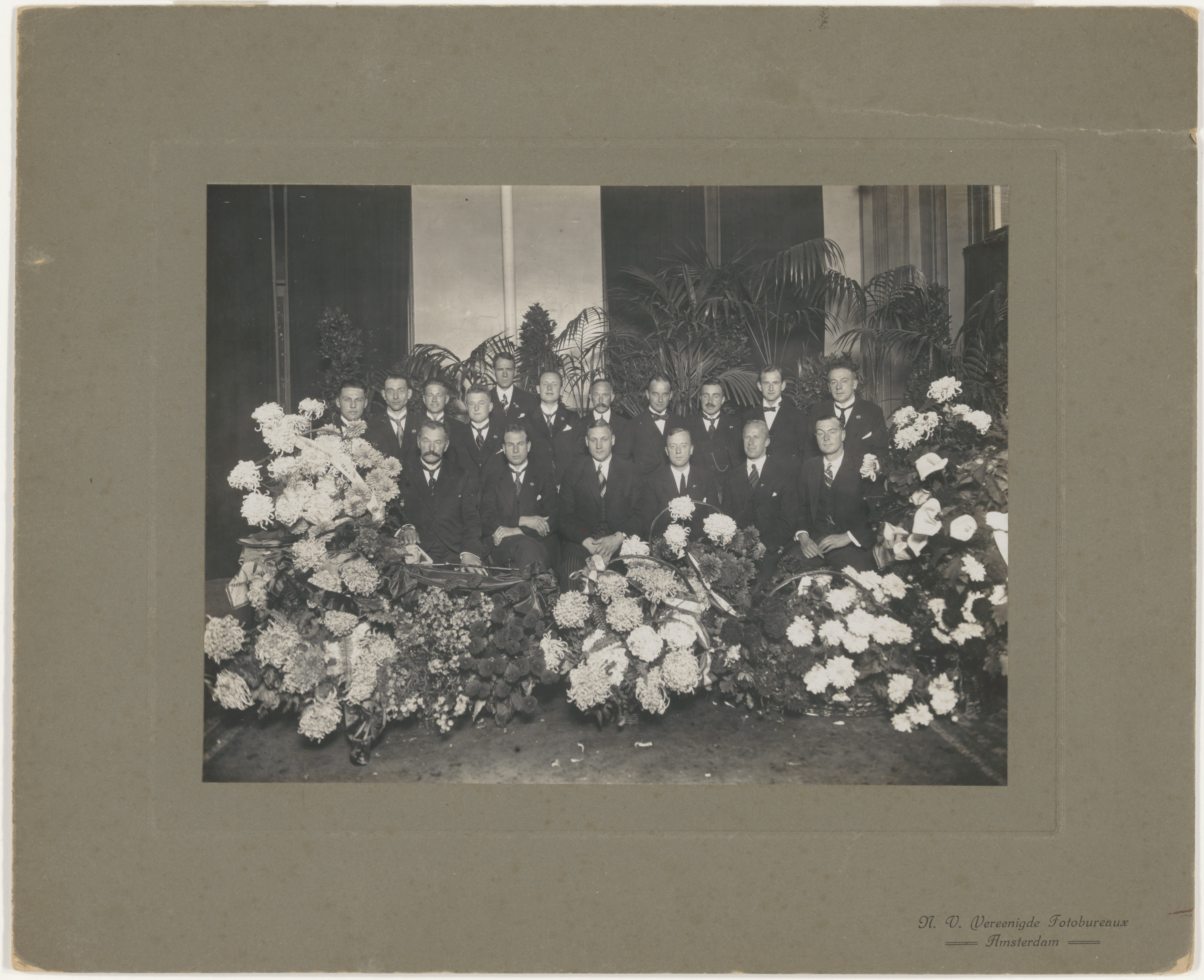 Groepsportret van het bestuur van voetbalvereniging DFC t.g.v. het (waarschijnlijk) …