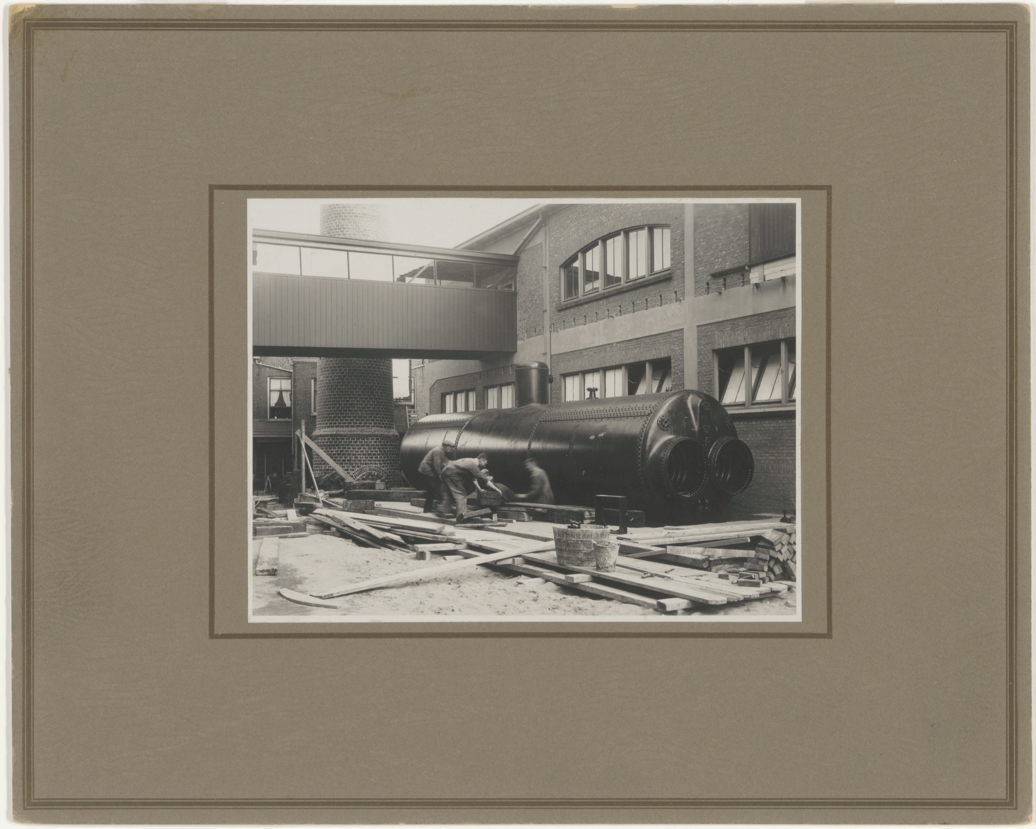 Na het stellen werd het ketelhuis er omheen gebouwd. Het betreft de ketel behorende bij de rechtse schoorsteen op afbeelding 552_405851.