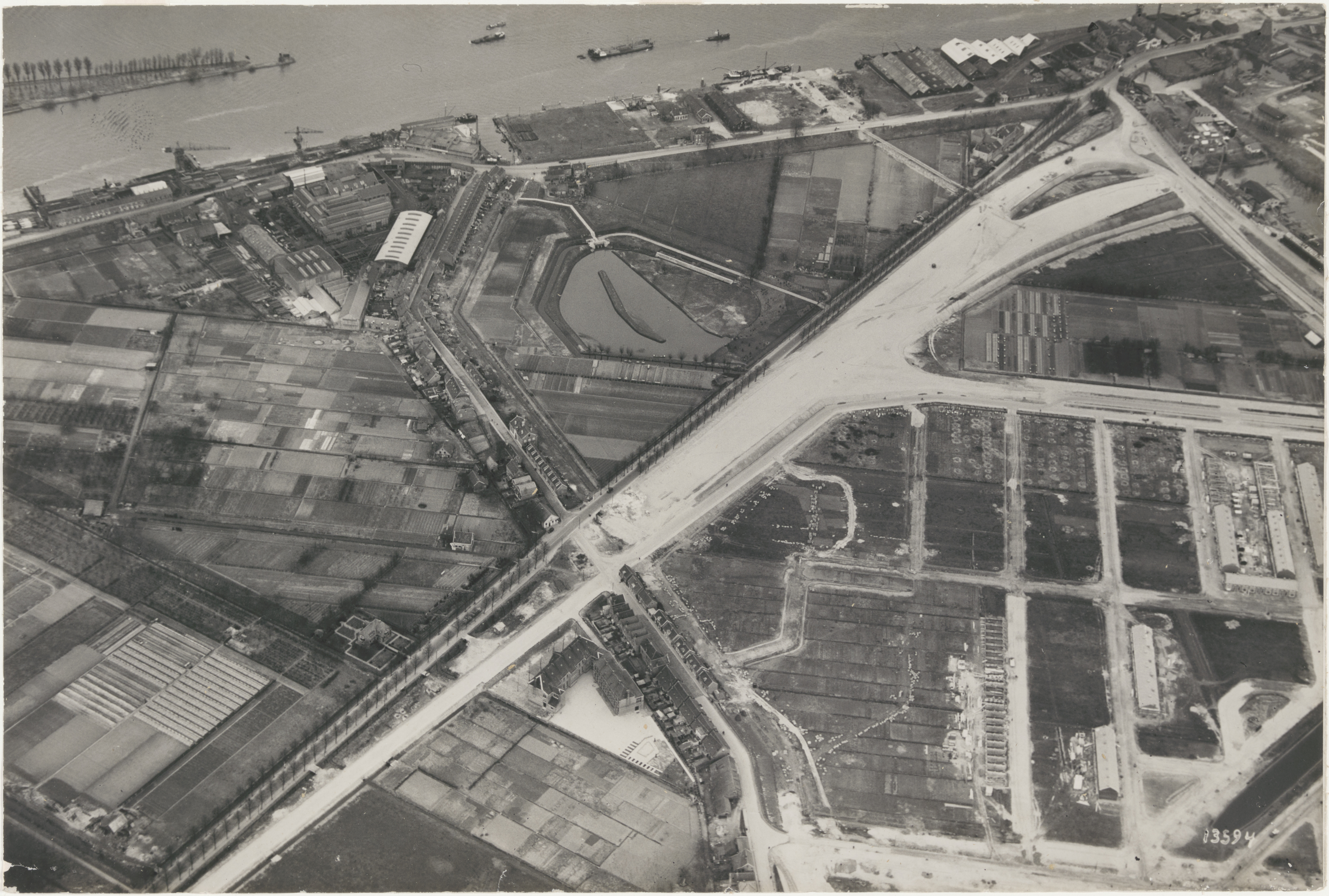 - Luchtfoto van de aanleg van Rijksweg 16. Te onderscheiden zijn Rijksstraatweg, Zuidendijk, Glazenstraat, ‘s-Gravendeelsedijk, Diepenbrockweg. Linksboven Penn & Bauduin aan het Mallegat.