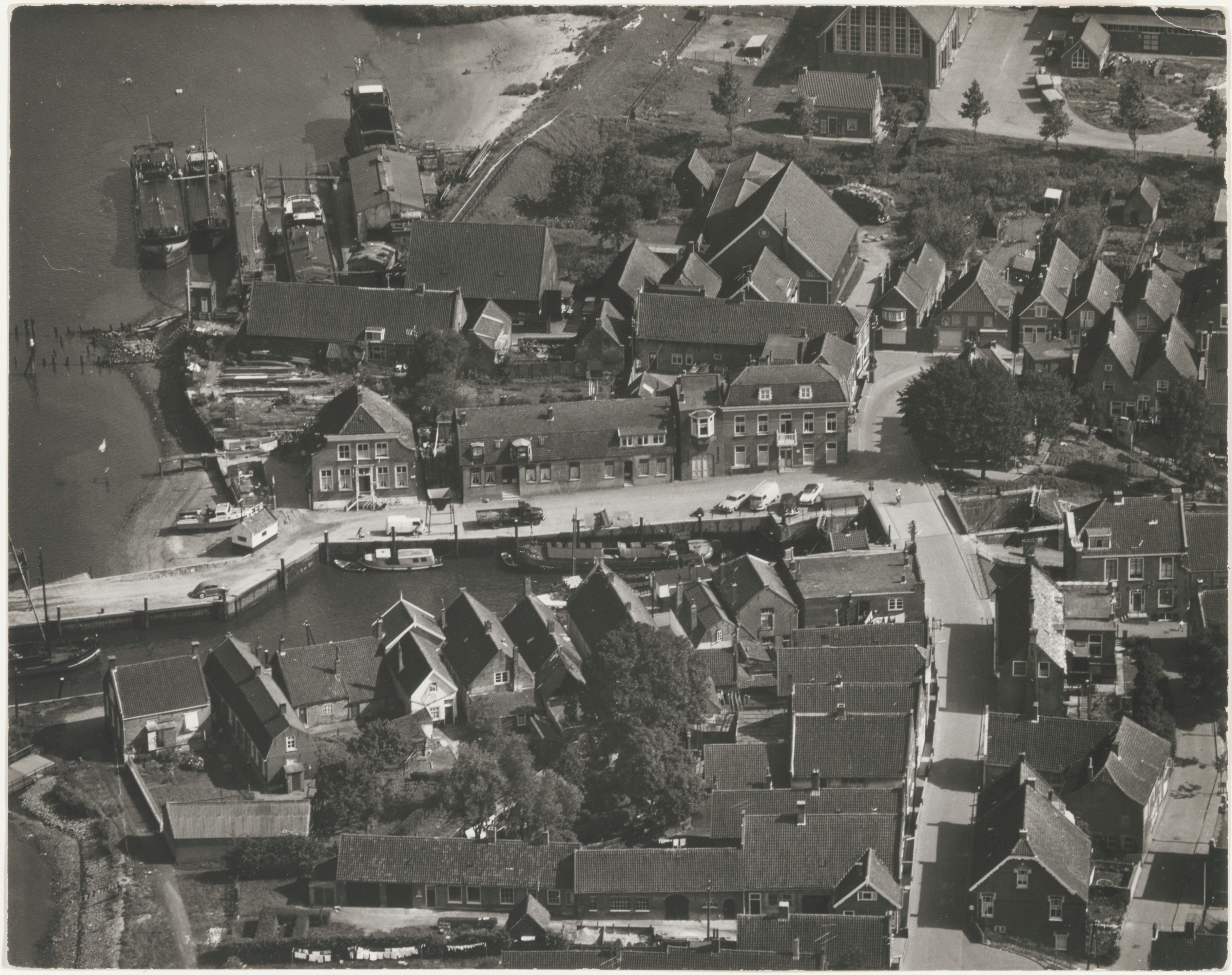 - Luchtfoto van Puttershoek langs de Oude Maas bij het veer, gezien in oostelijke richting. Rechts van het midden Weverseinde en dwars over het midden Westhavenzijde.