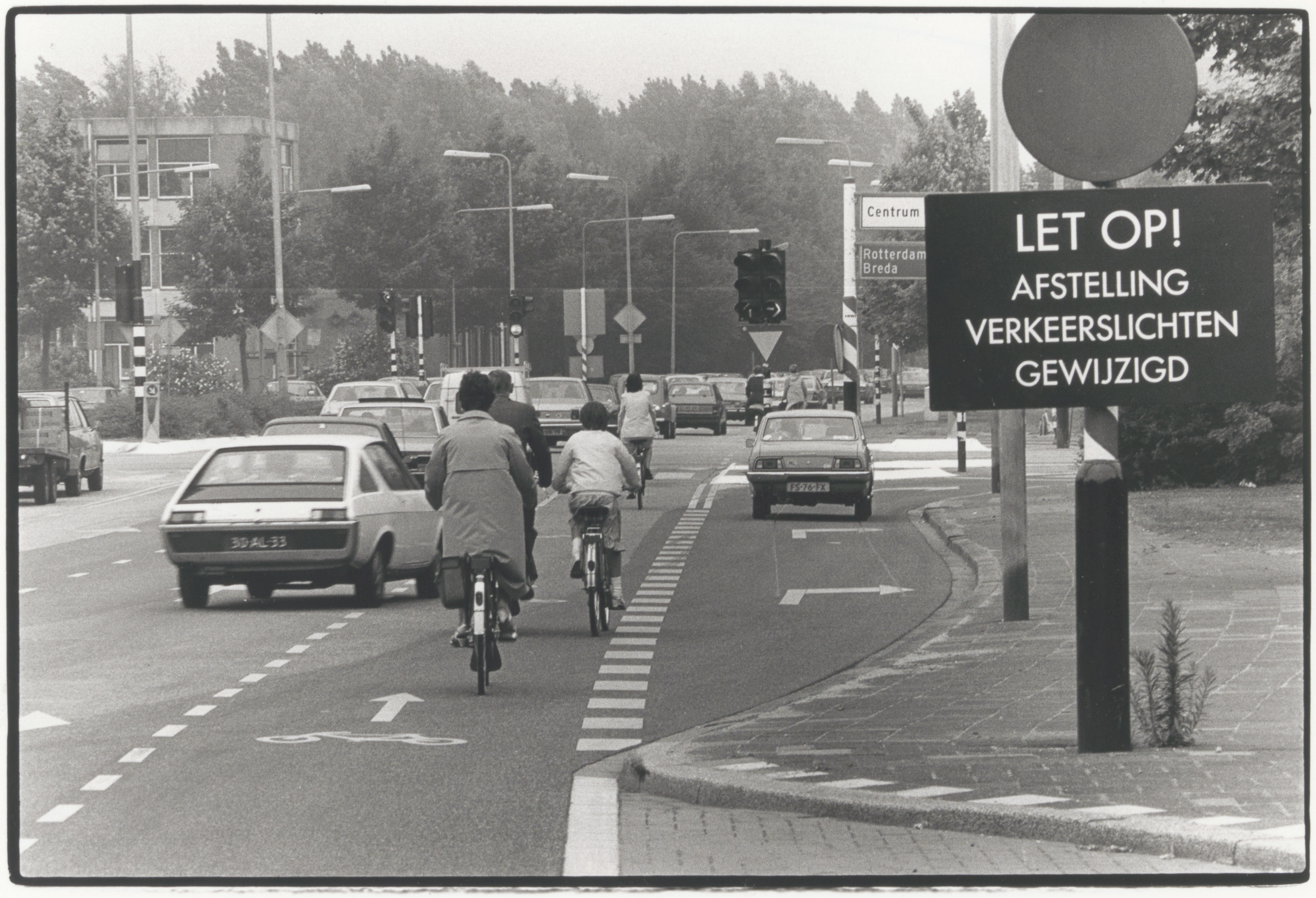 - auto's fietsers kweekscholen lantaarns / straatverlichting richtingborden / wegwijzers verkeerslichten