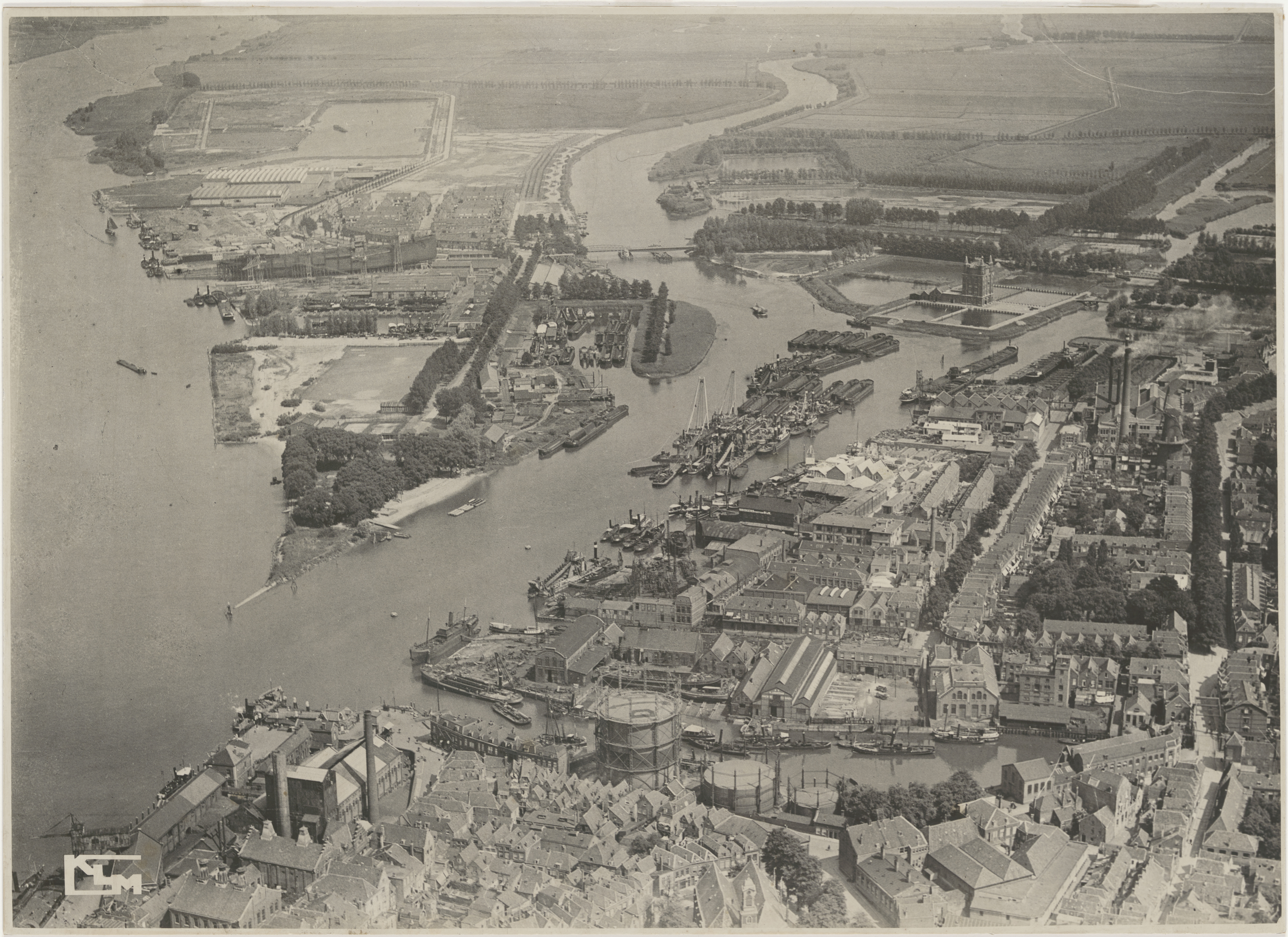 - Luchtfoto van het noordoostelijk deel van Dordrecht. Op de voorgrond de Riedijkshaven en omgeving, linksboven de industrieën op de Staart.