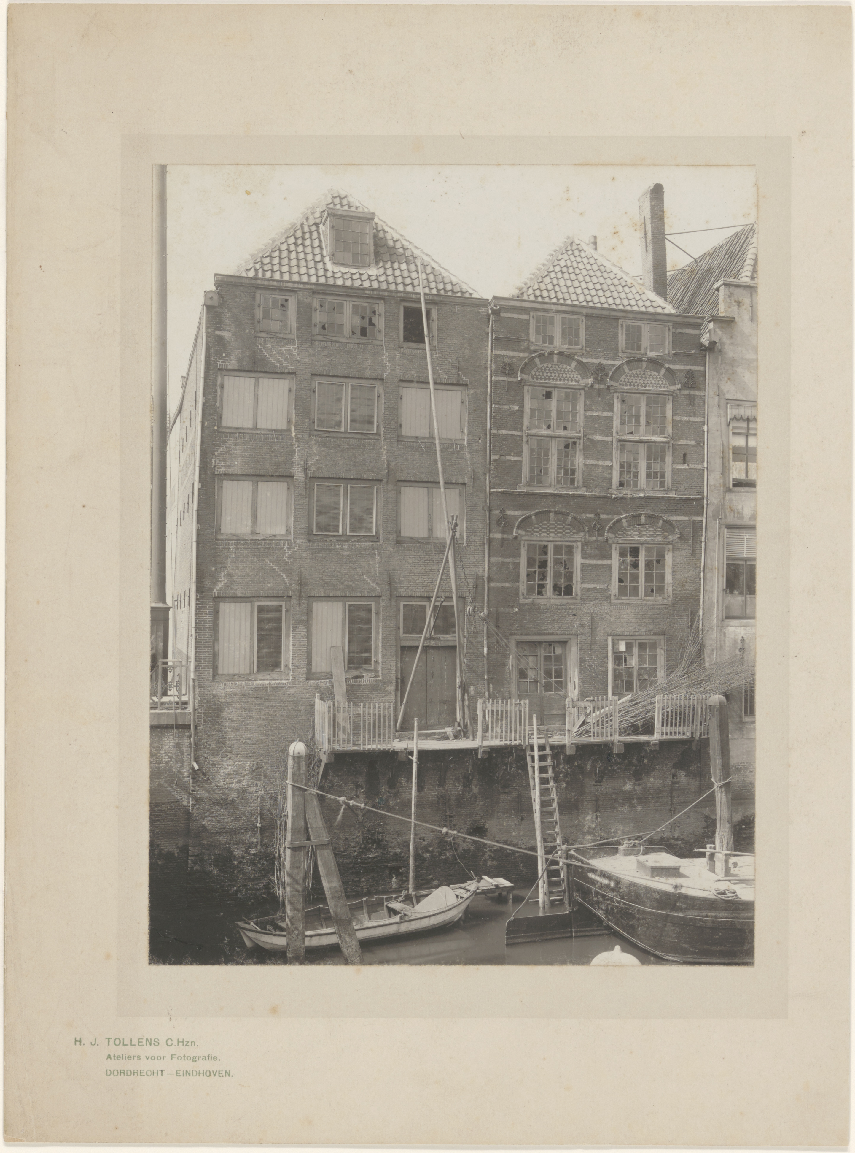 - Achterkant van slooprijpe panden in de Wijnstraat, gezien vanaf de Nieuwbrug over de Wijnhaven. Links is Huis Sint Jacob in Galicië.