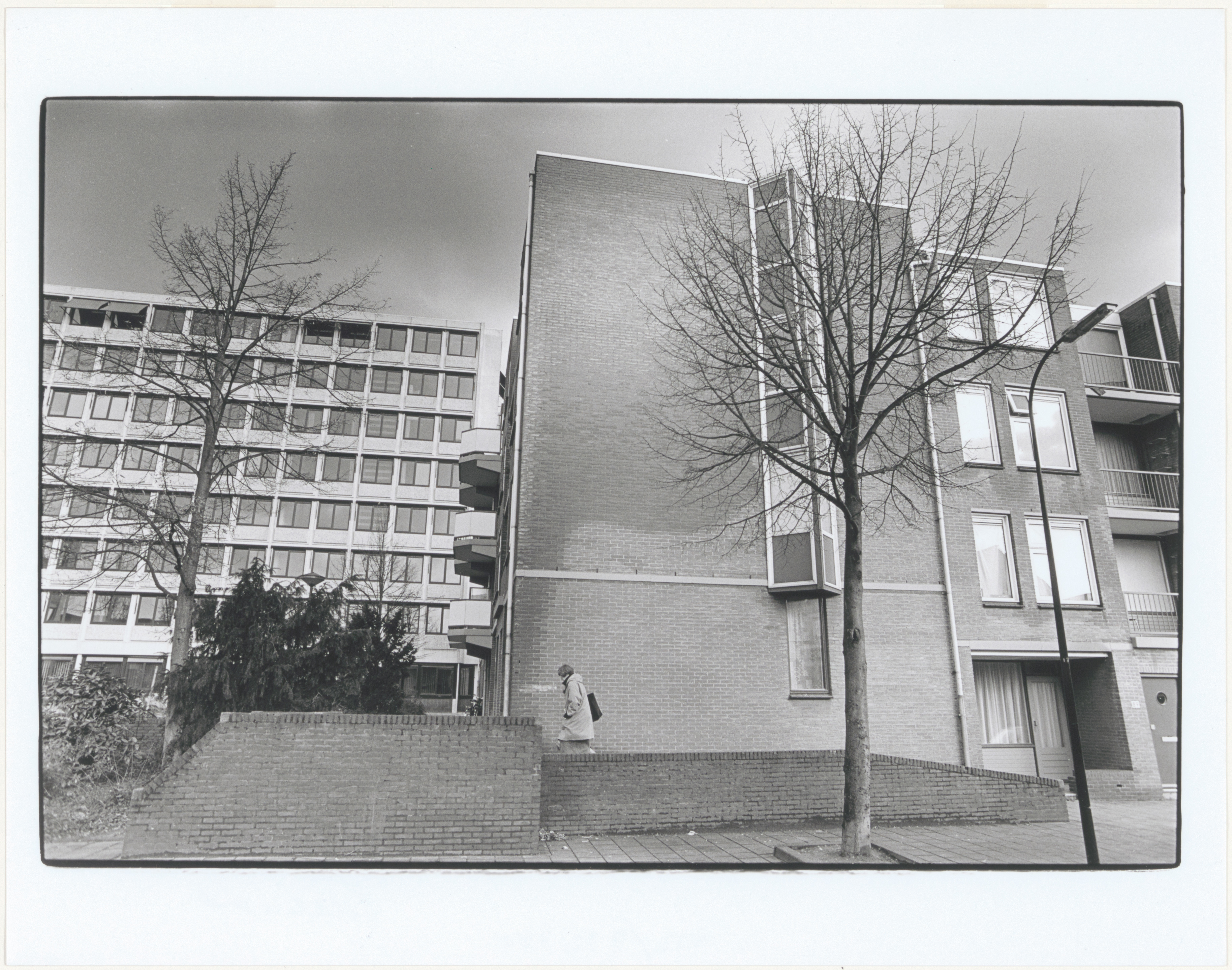 Doorkijk vanaf het Geldelozepad in noordelijke richting op de Spuiboulevard met gebouw …
