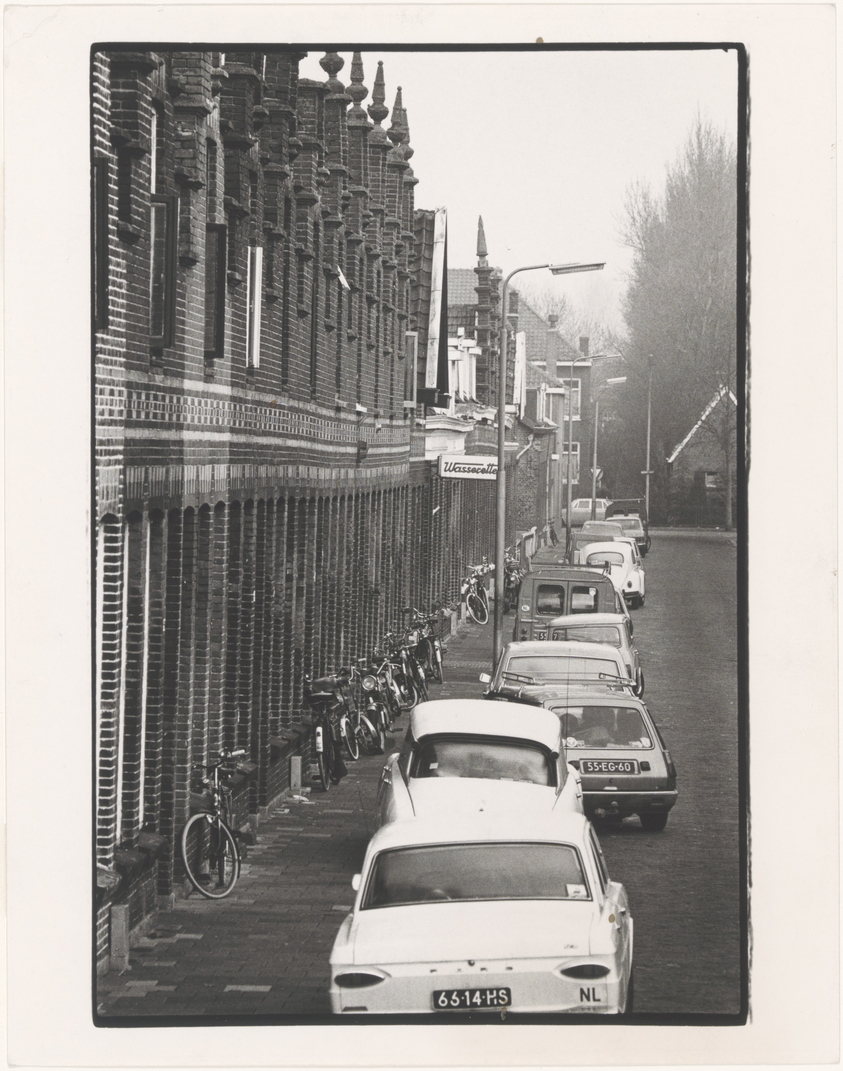 - auto's fietsen / rijwielen lantaarns / straatverlichting trapgevels
