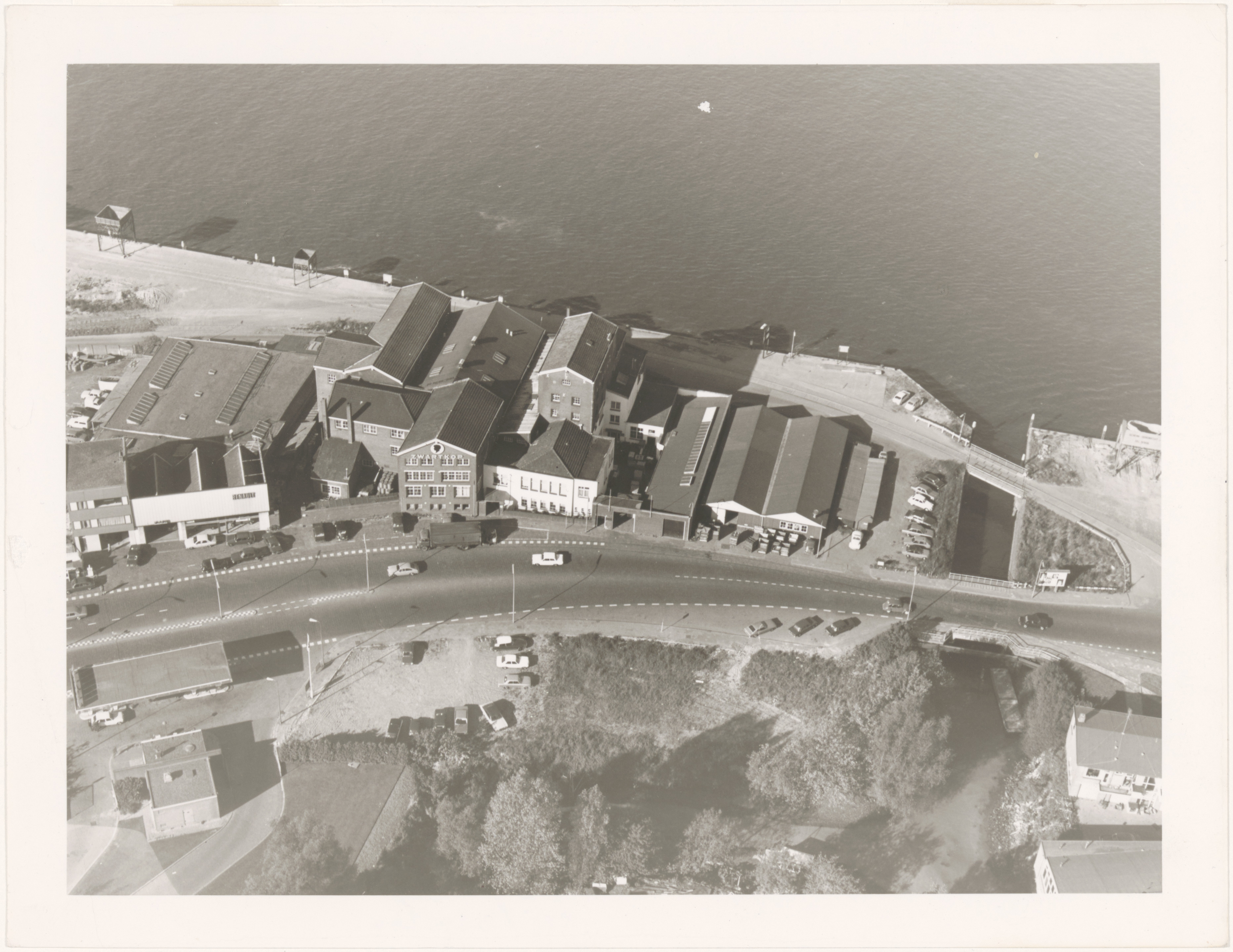 Luchtfoto van de Schwartzkopf fabriek aan de Dokweg. Bovenin de Handelskade langs de …
