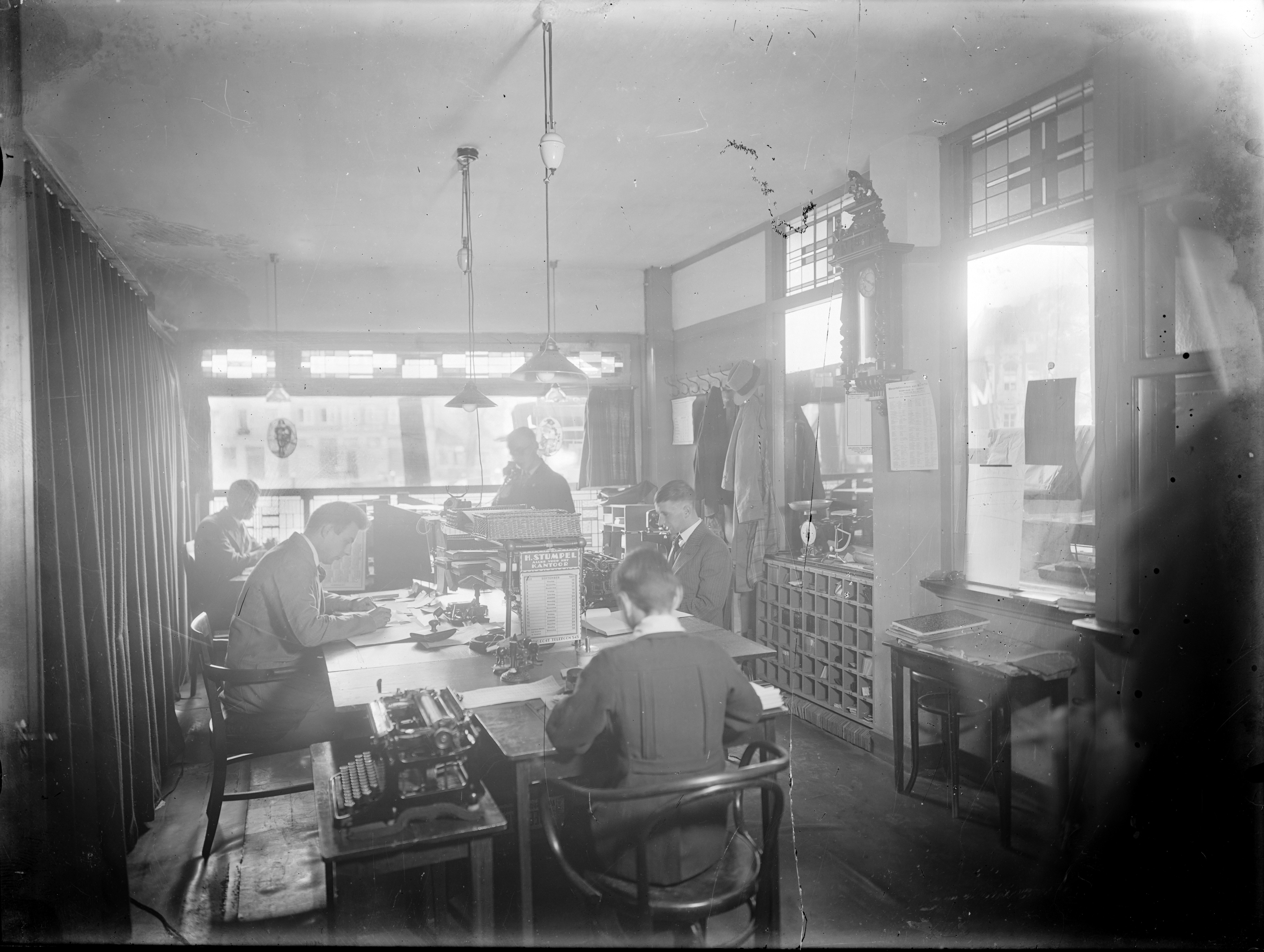 - Administratiekantoor van de Dordtsche Glashandel aan de Kuipershaven. Linksvoor J.H. Rijkelijkhuizen, linksachter H. Louman, rechtsvoor J.H. Sandtke, rechtsachter R.R. Reitsma (?)
