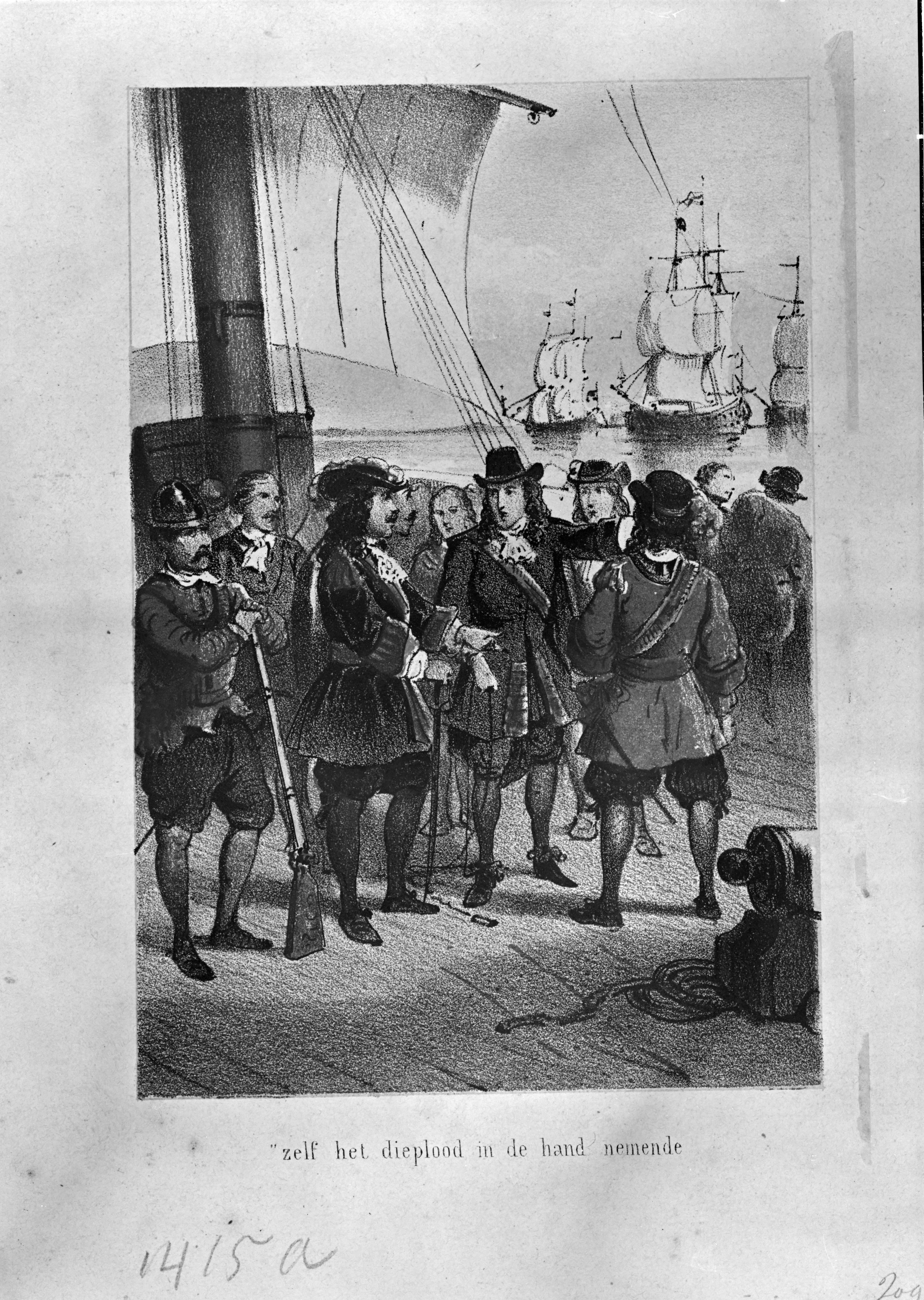 tekening Johan de Witt ----- (1415a) 'zelf het dieplood in de hand nemende" --- uit o.a.: "Schetsen uit het leven van Johan de Witt en Michiel Adriaansz. de Ruiter", Gerrit Rinse Voormeulen van Boekeren;