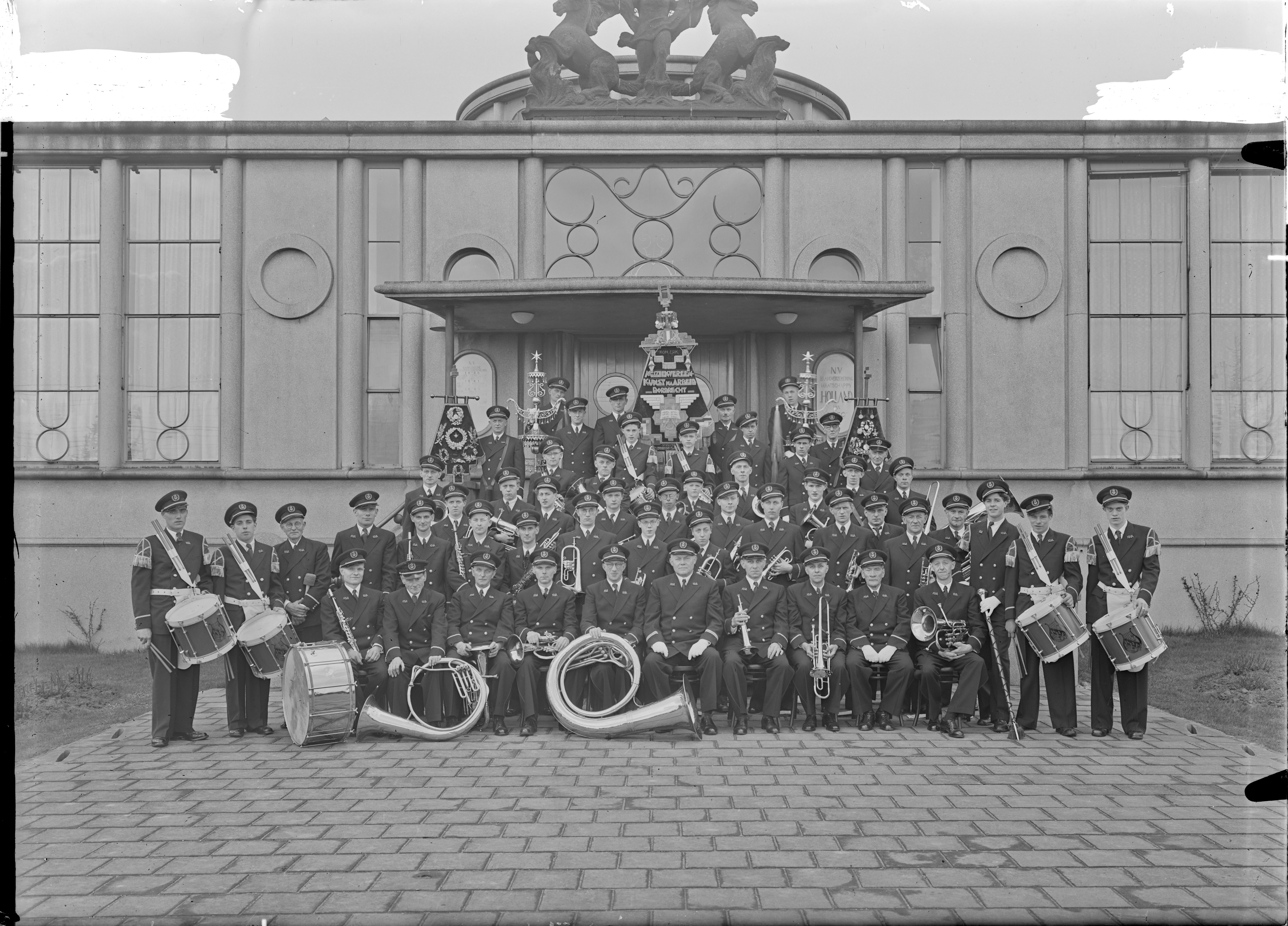 - groepsportretten muziekkorpsen vaandels verzekeringmaatschappijen