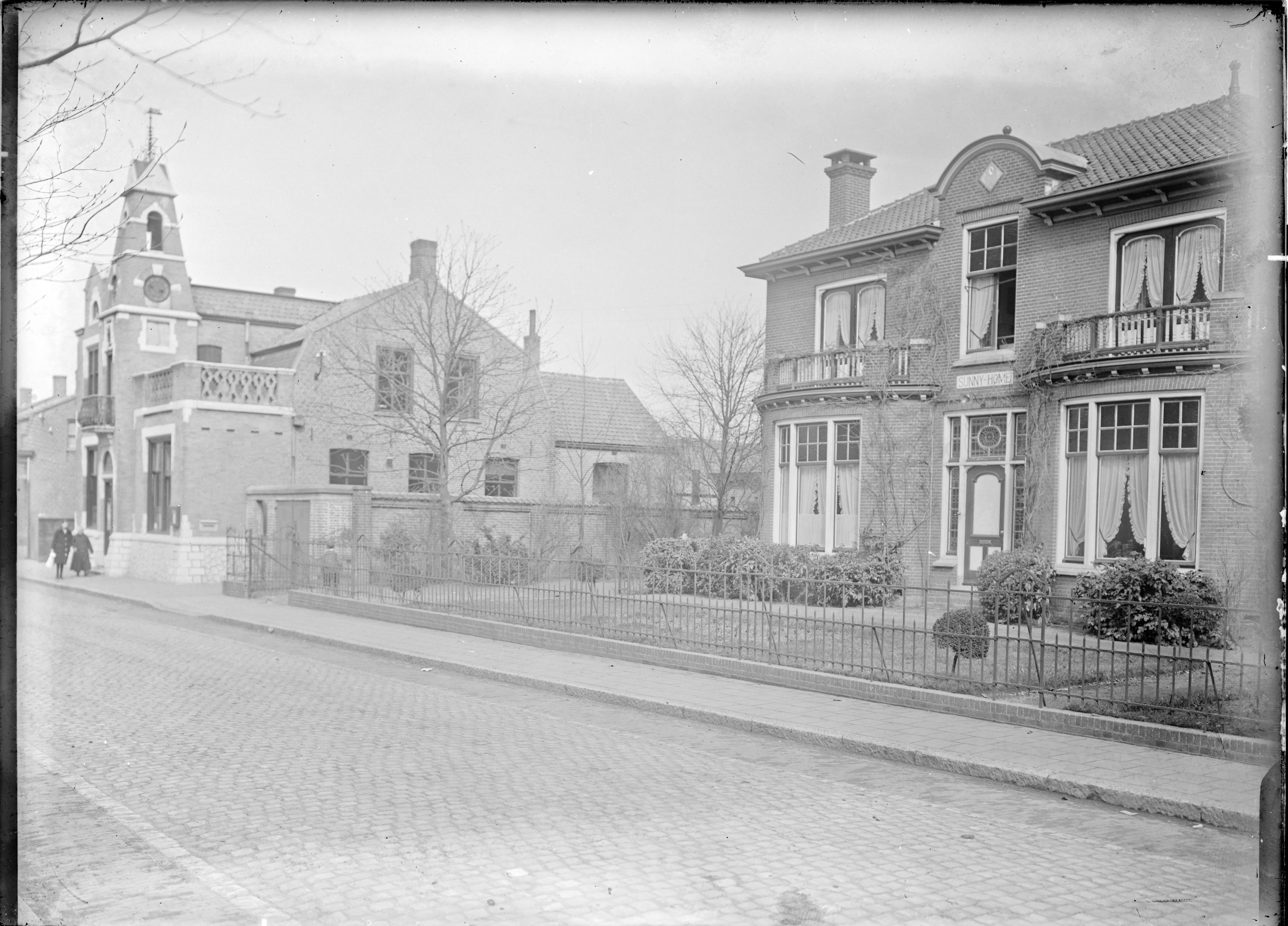 - De Nieuwstraat in Gilze. Rechts de artsenwoning Sunny-Home, links het gemeentehuis met gevangenis.