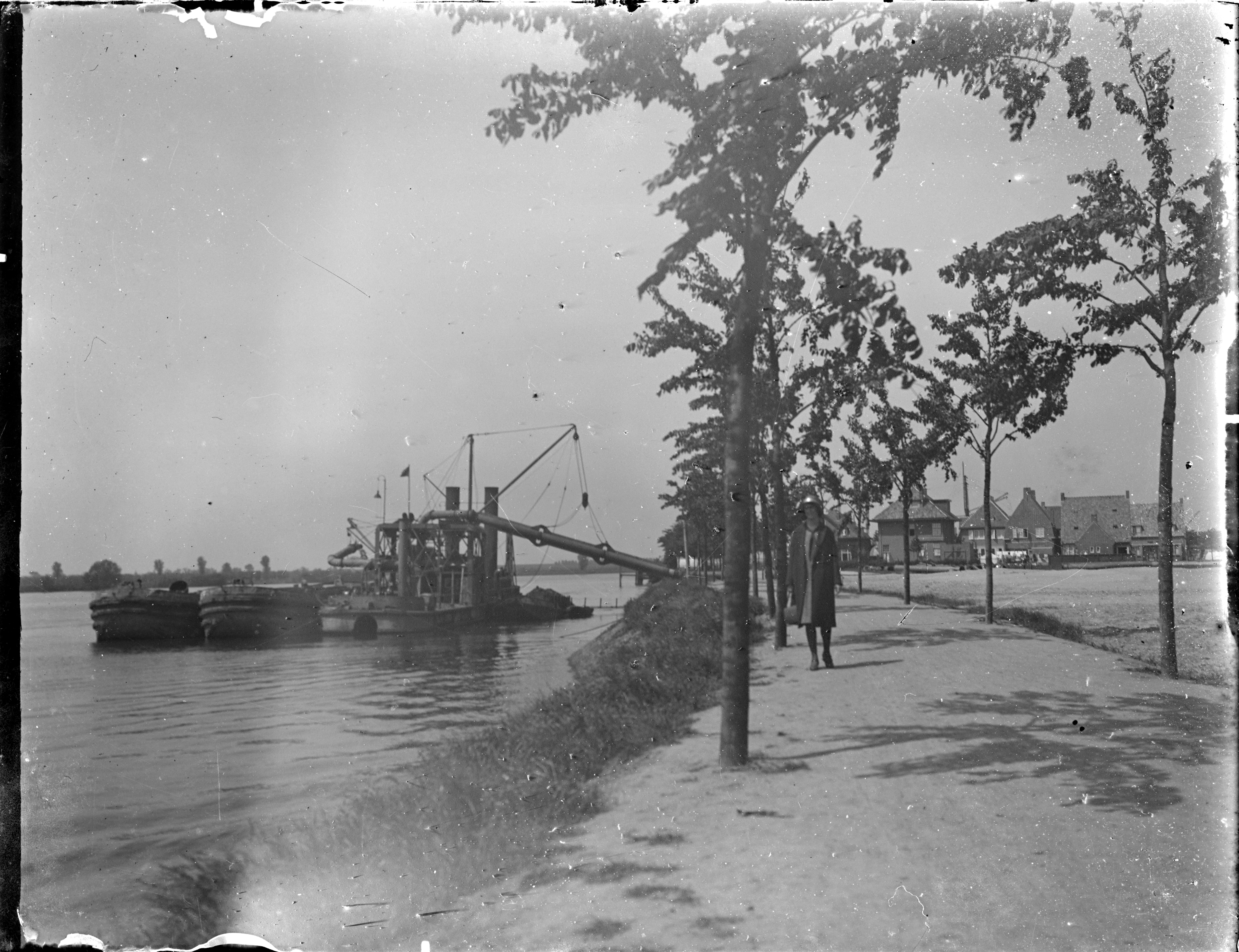 - Baggermolen in de Merwede langs de Adriaan Volkersingel in Sliedrecht. Op de achtergrond woningen in de Piet Rijsdijkstraat.