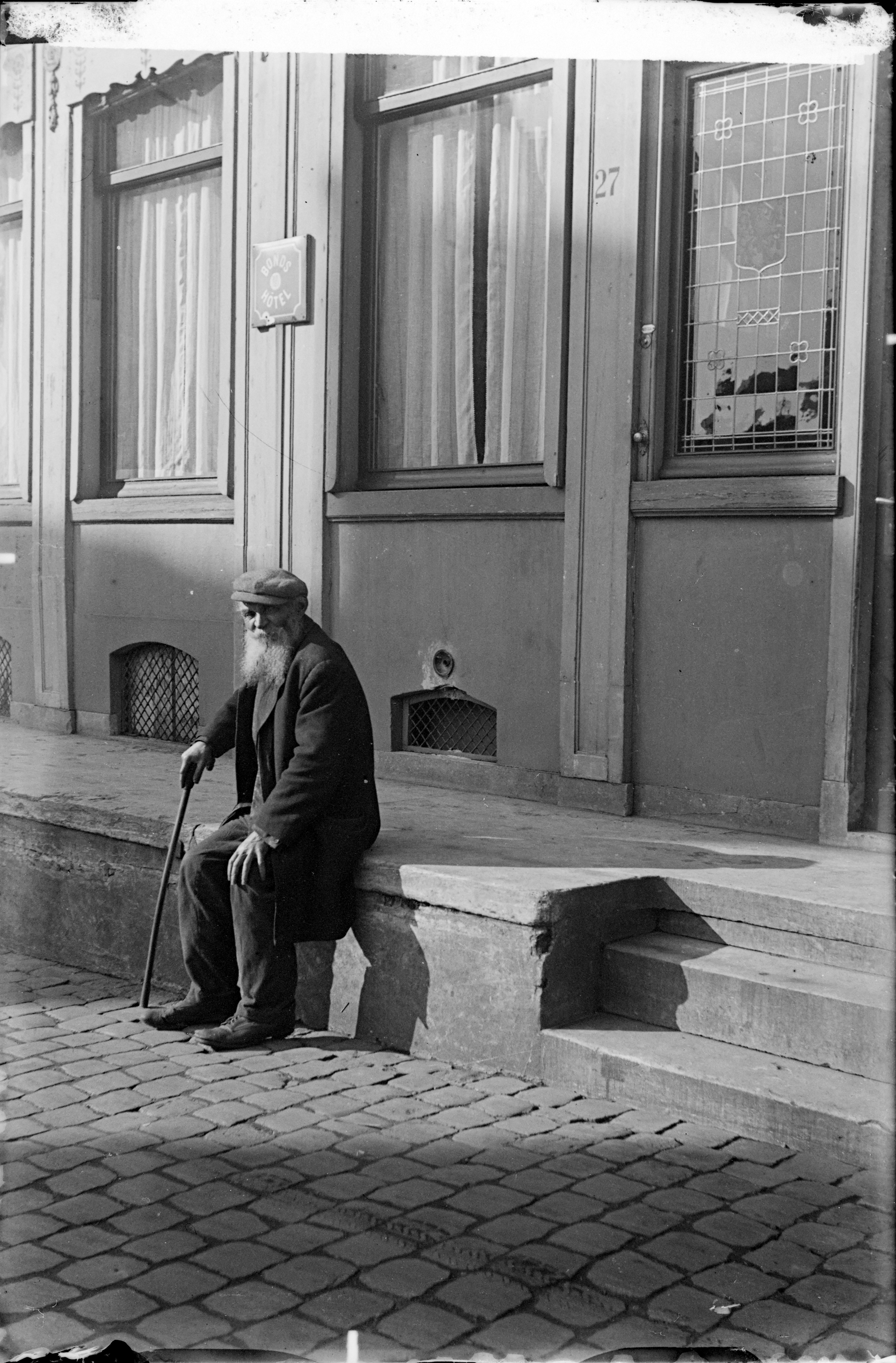 - Bejaarde man neemt zijn rust op de stoep van Hotel Bellevue in de Boomstraat.