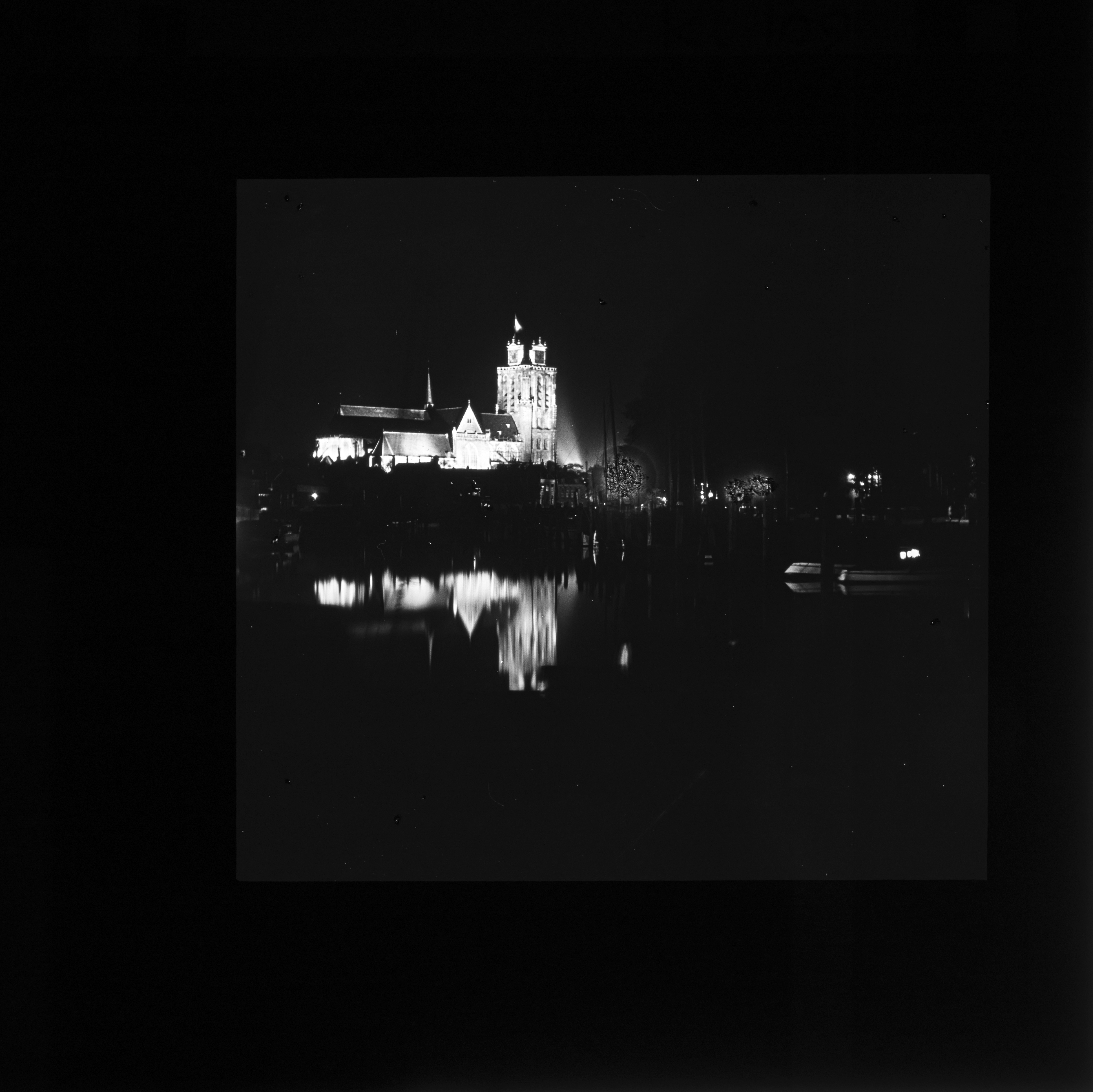 - Verlichte Grote Kerk gezien vanaf de Nieuwe Haven.