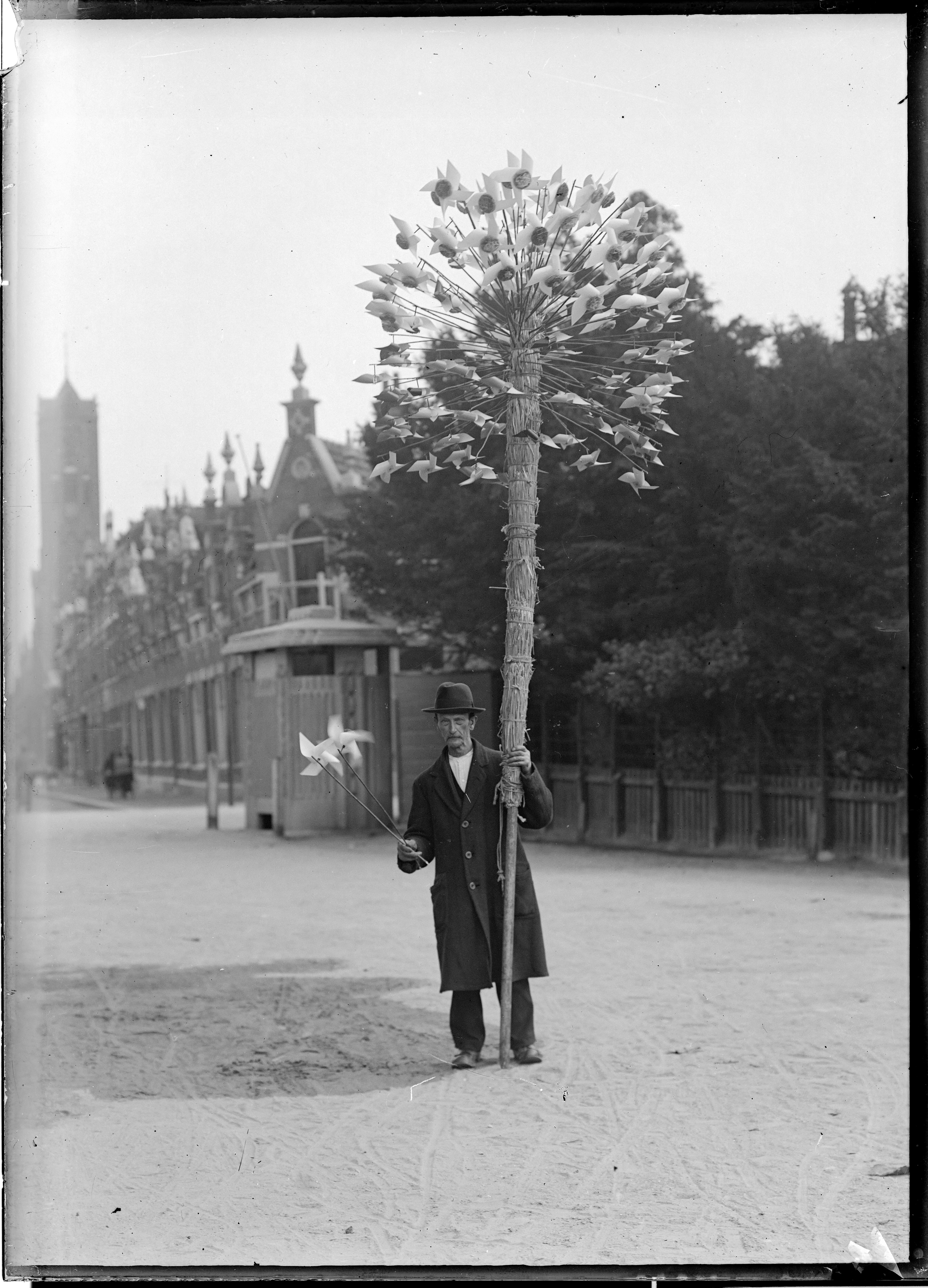 - Straatventer met molentjes in de Cornelis de Wittstraat. Links de Wilhelminakerk op de hoek van de Blekersdijk.