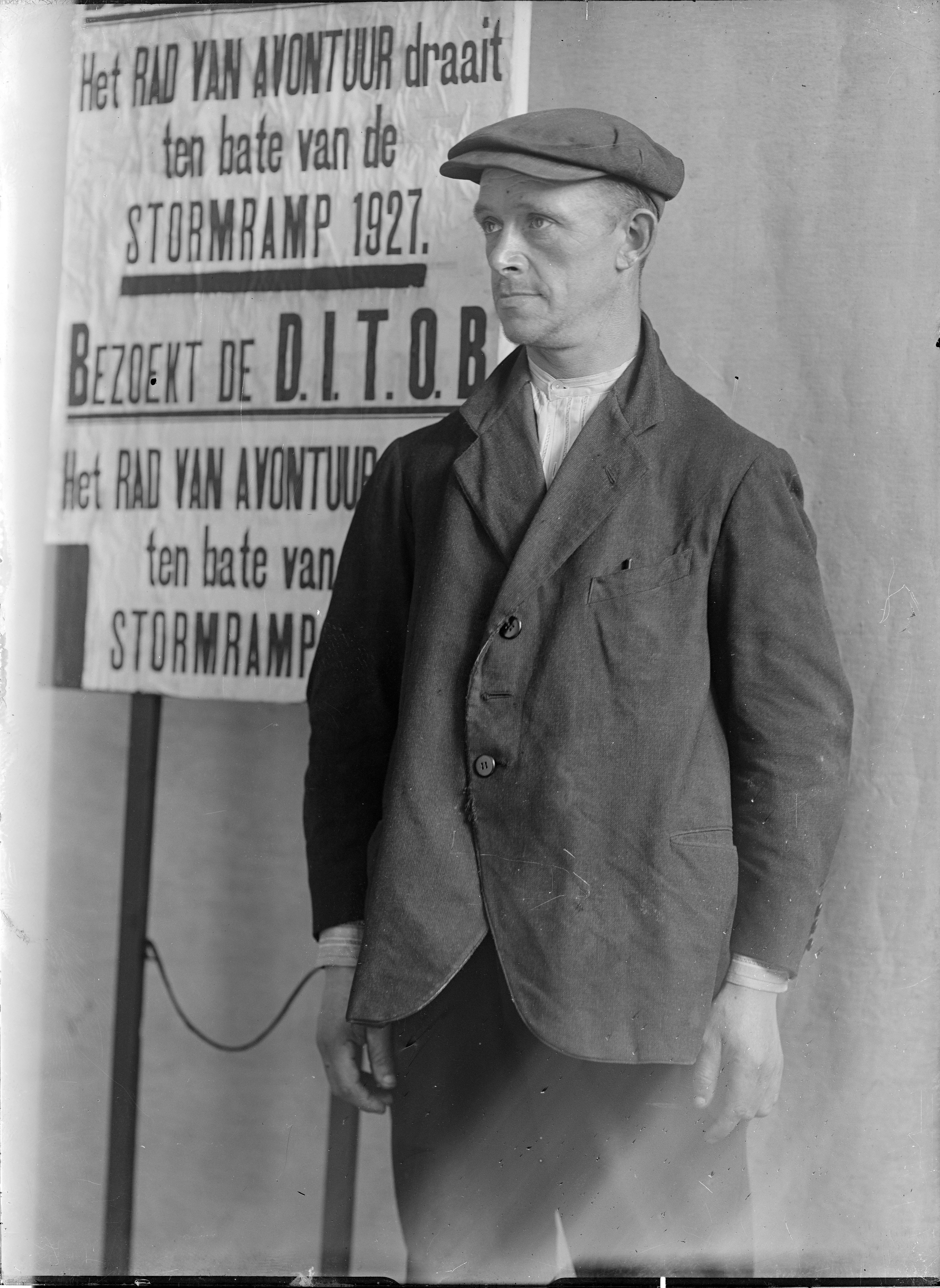 - Aankondiging van het rad van avontuur tijdens de Dordtsche Internationale Tentoonstelling Op Bakkerijgebied (DITOB) in schouwburg Kunstmin ten bate van de stormramp.