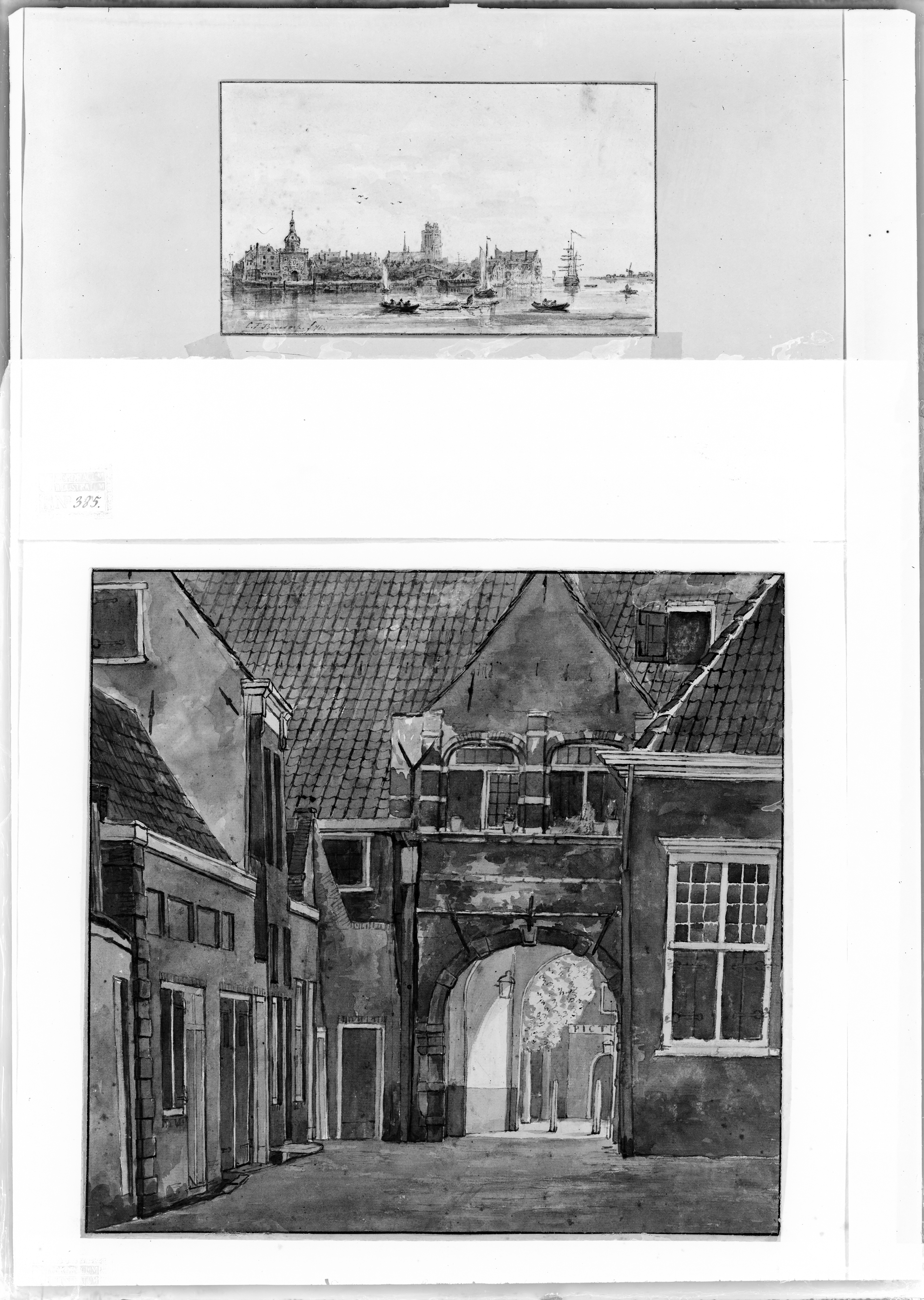 Boven: Tekening een gezicht op Dordrecht vanaf de Oude Maas. Links de Groothoofdspoort, …