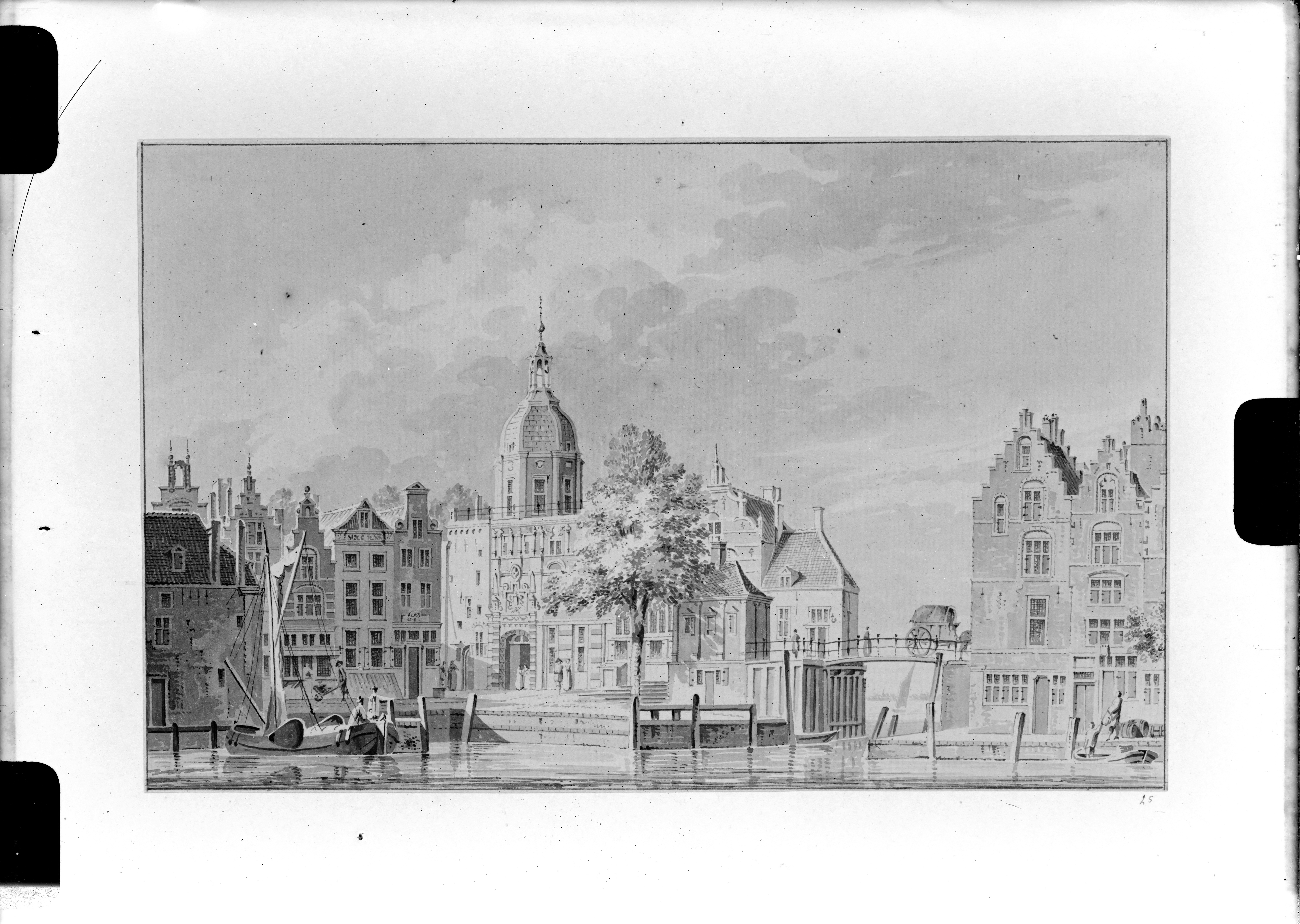 Tekening van de Groothoofdspoort en Boombrug aan de zijde van de Boomstraat. Links de …