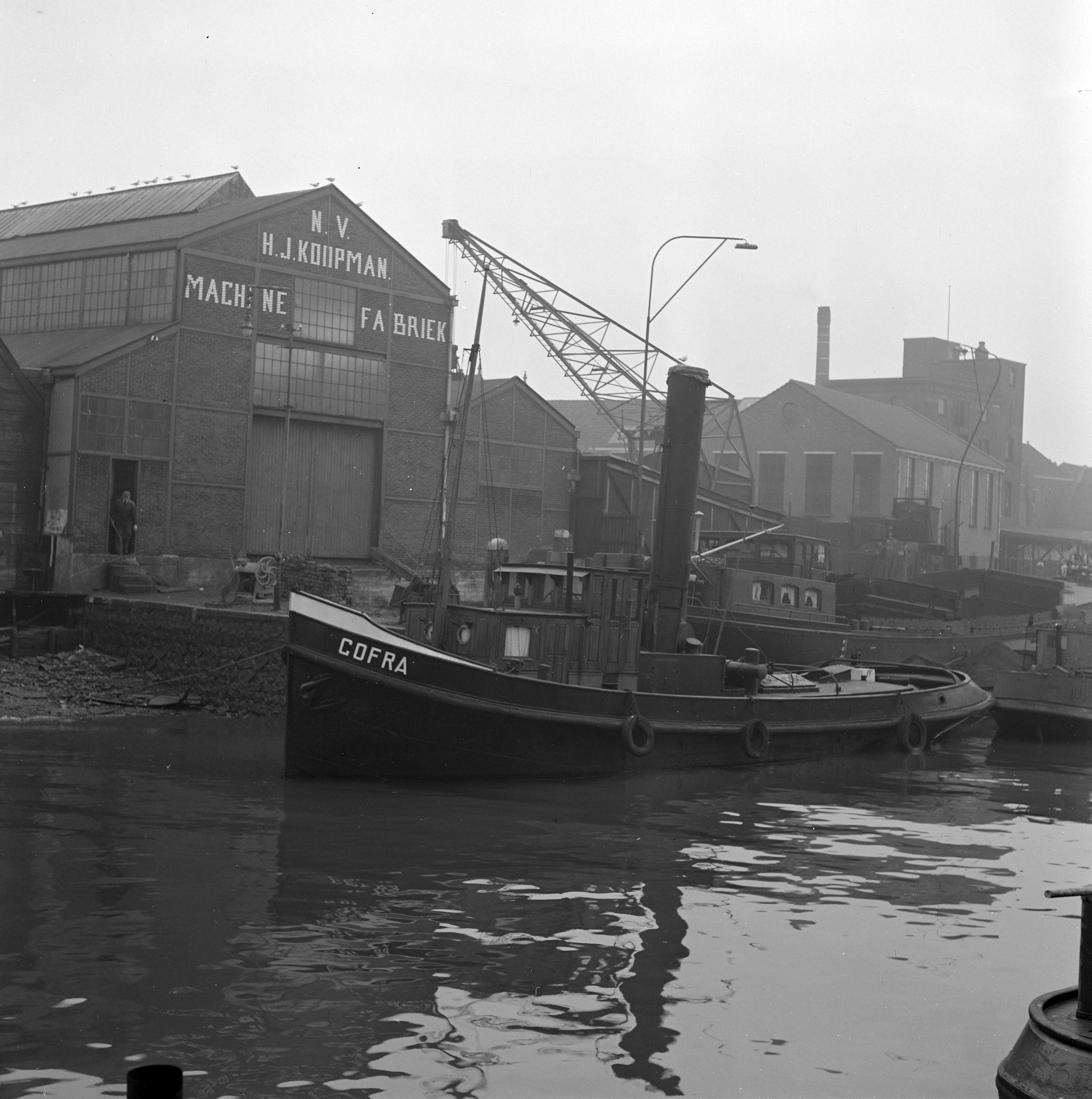 - Oostelijke zijde van de Riedijkshaven met zicht op Machinefabriek Koopman welke gevestigd was aan de Noorderstraat. Op de voorgrond een riviersleepboot genaamd Cofra.