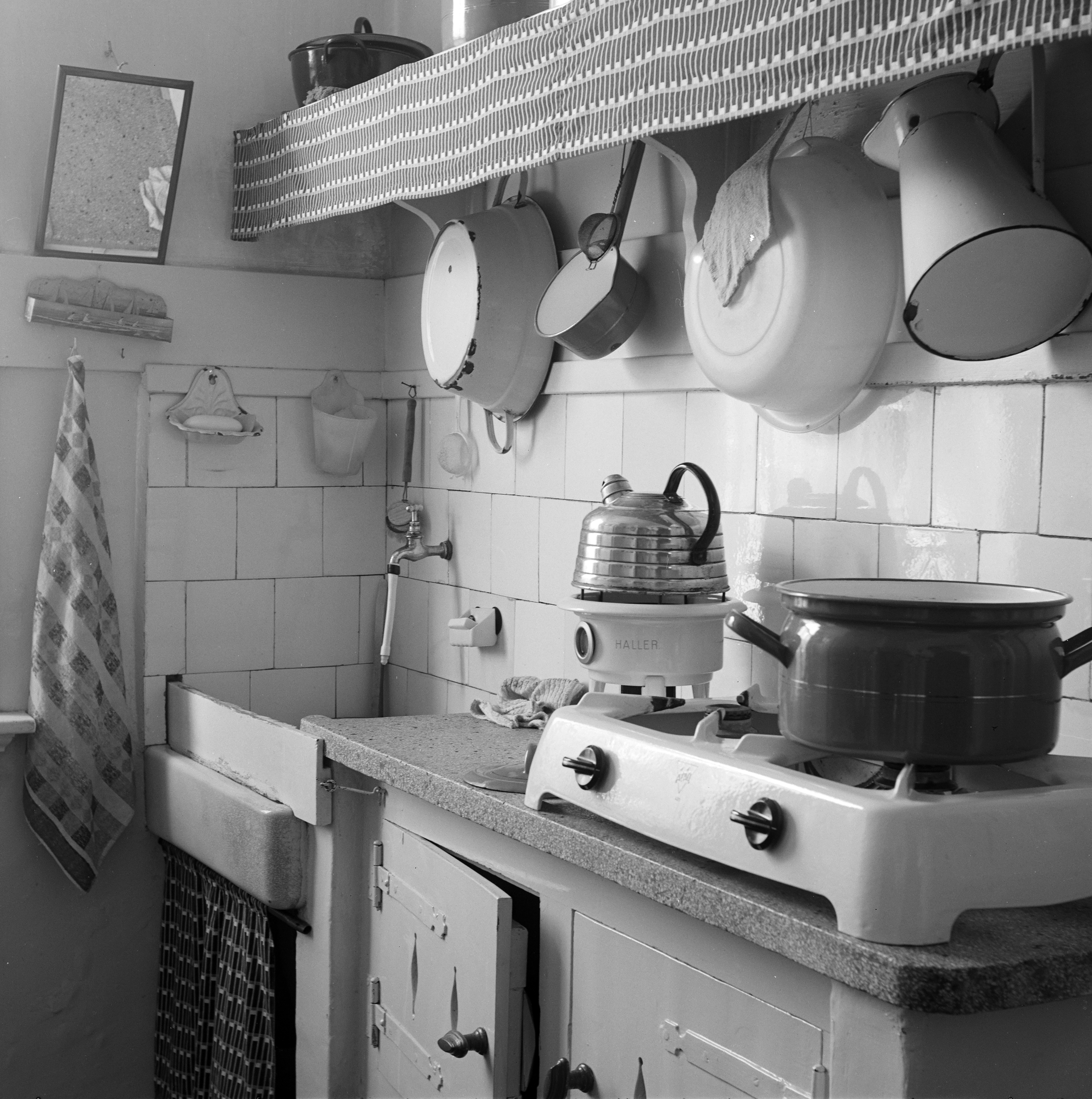 - Keuken vóór renovatie met koudwaterkraan, petroleumstel en gasstel.