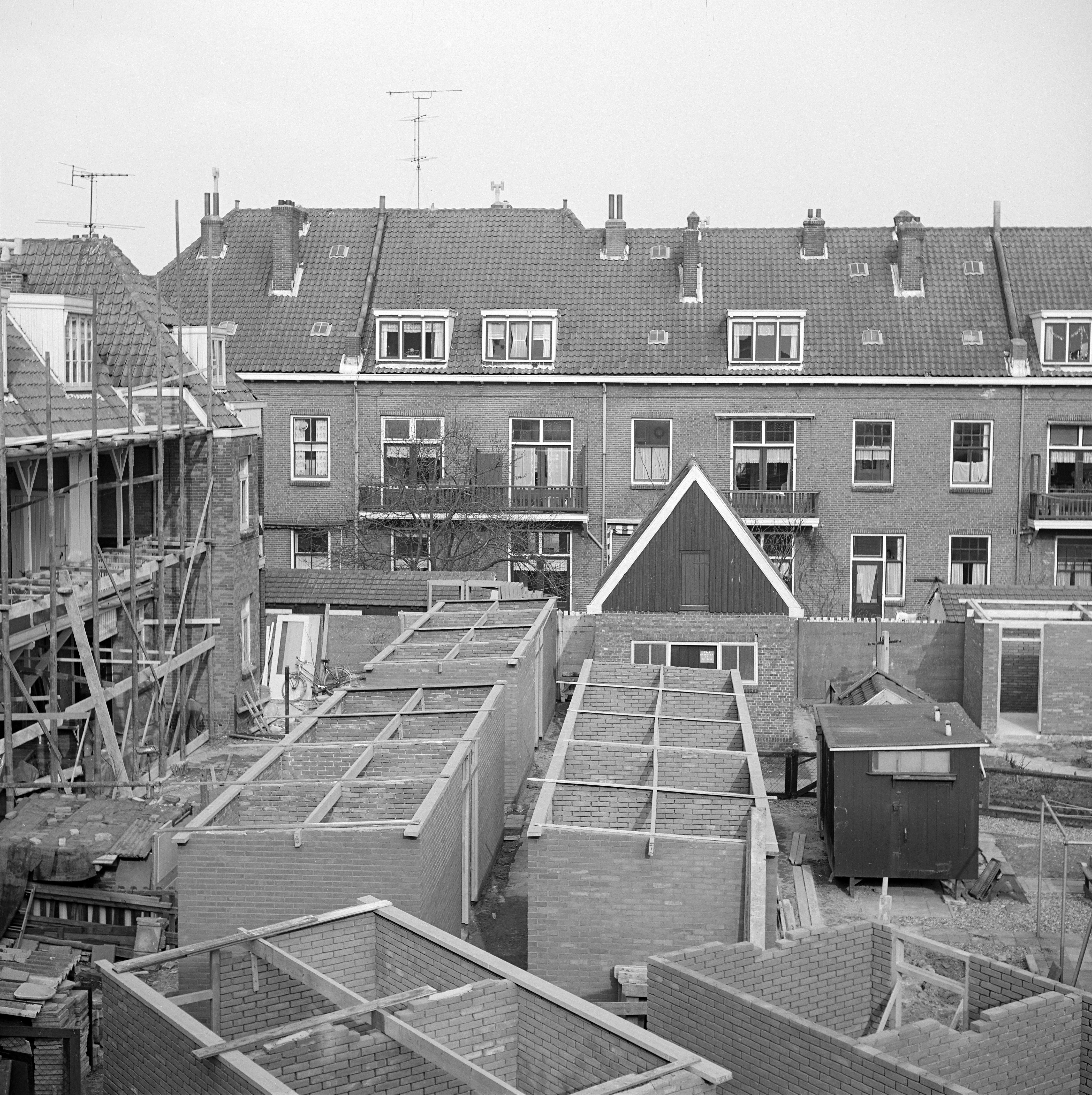 Bouw van schuurtjes aan de achterkant van huizen in de Tollensstraat.