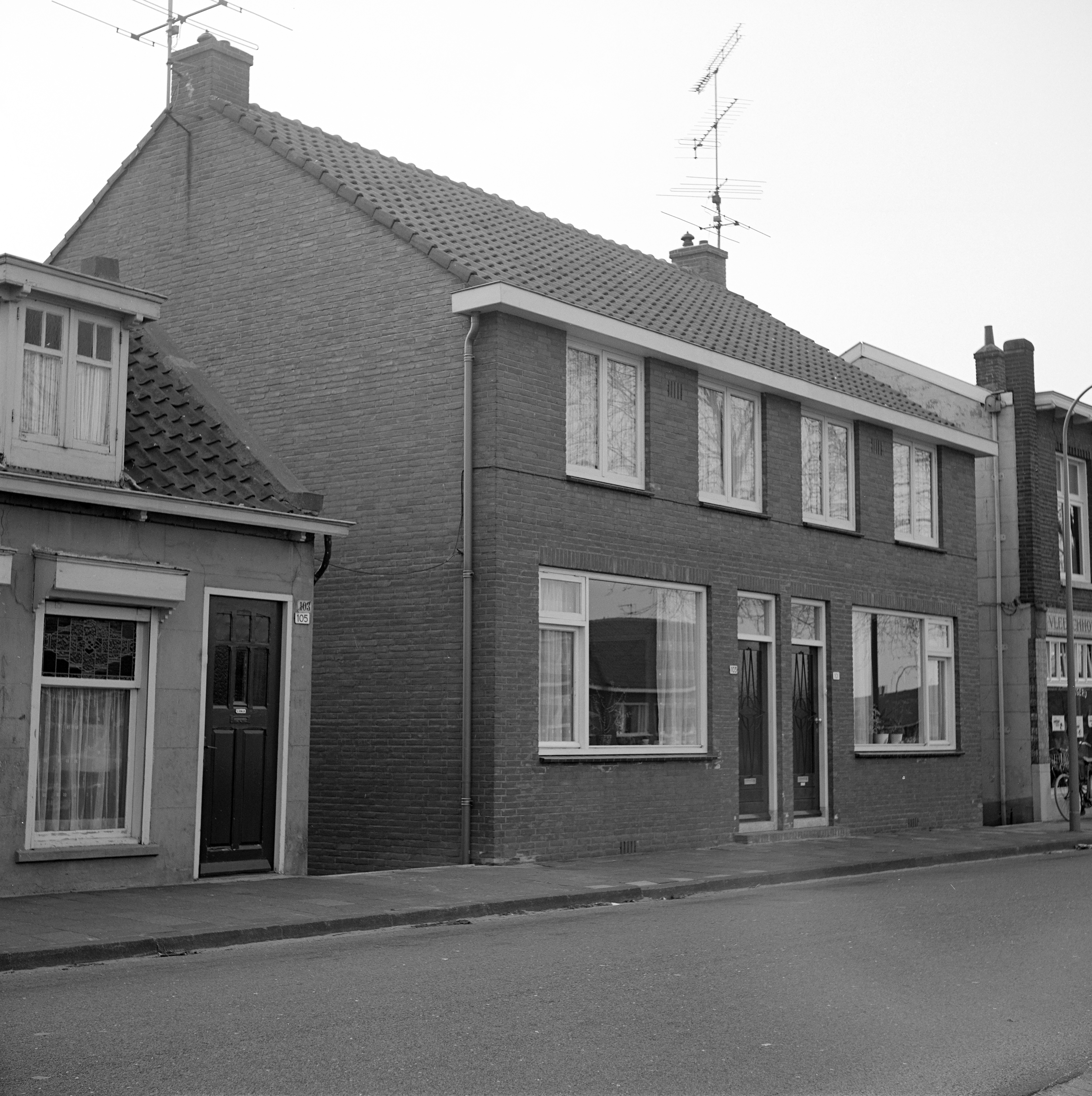 Links: Zuidendijk 103, bewoond door gezin Muller-v.Leeuwen. Rechts op de foto is nog een stukje van de slagerij (Woestenburg) zichtbaar.