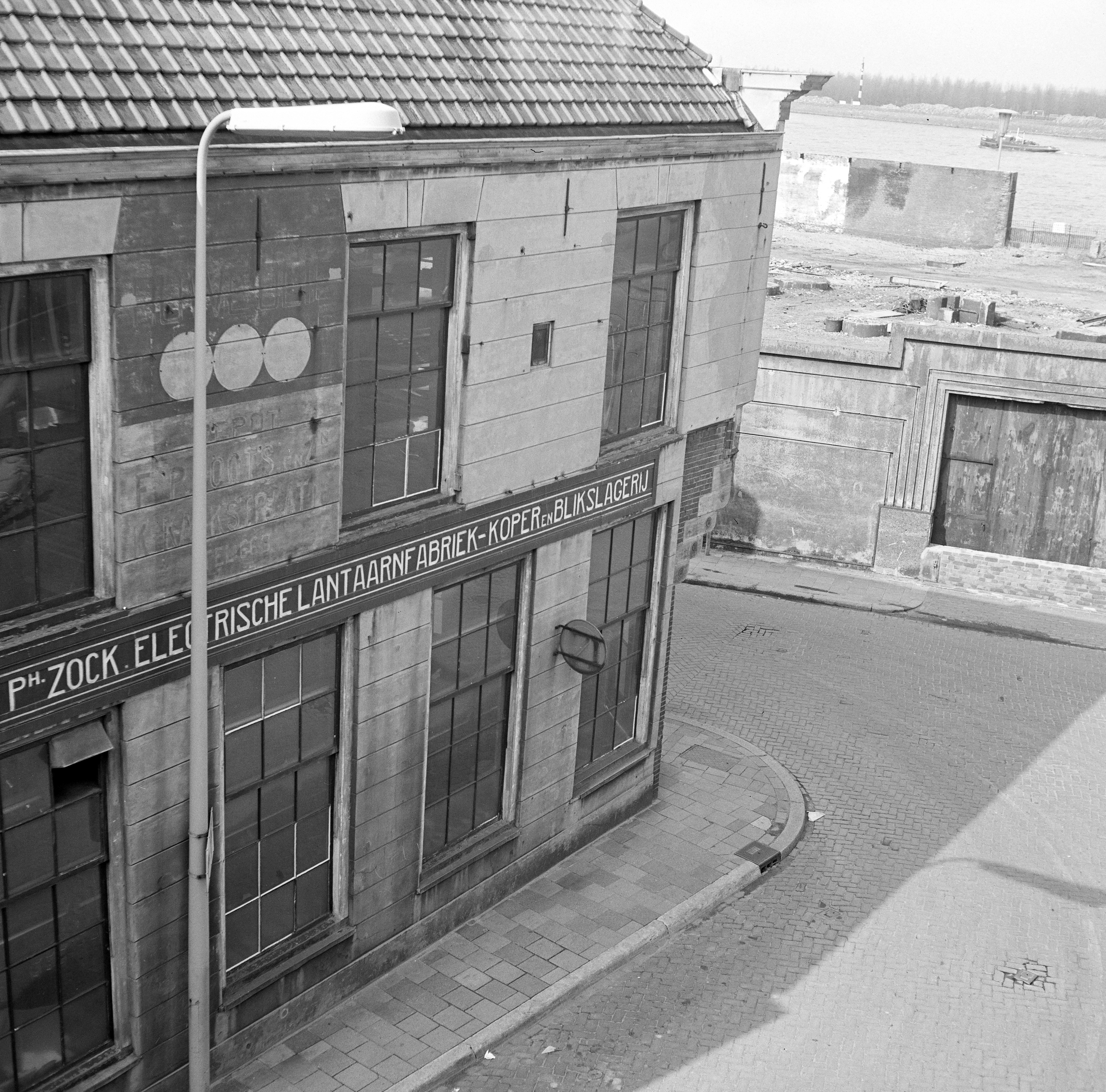 Koper- en blikslagerij Zock op de hoek van Bleijenhoek en Riedijk. Op de achtergrond de sloop van de gasfabriek.