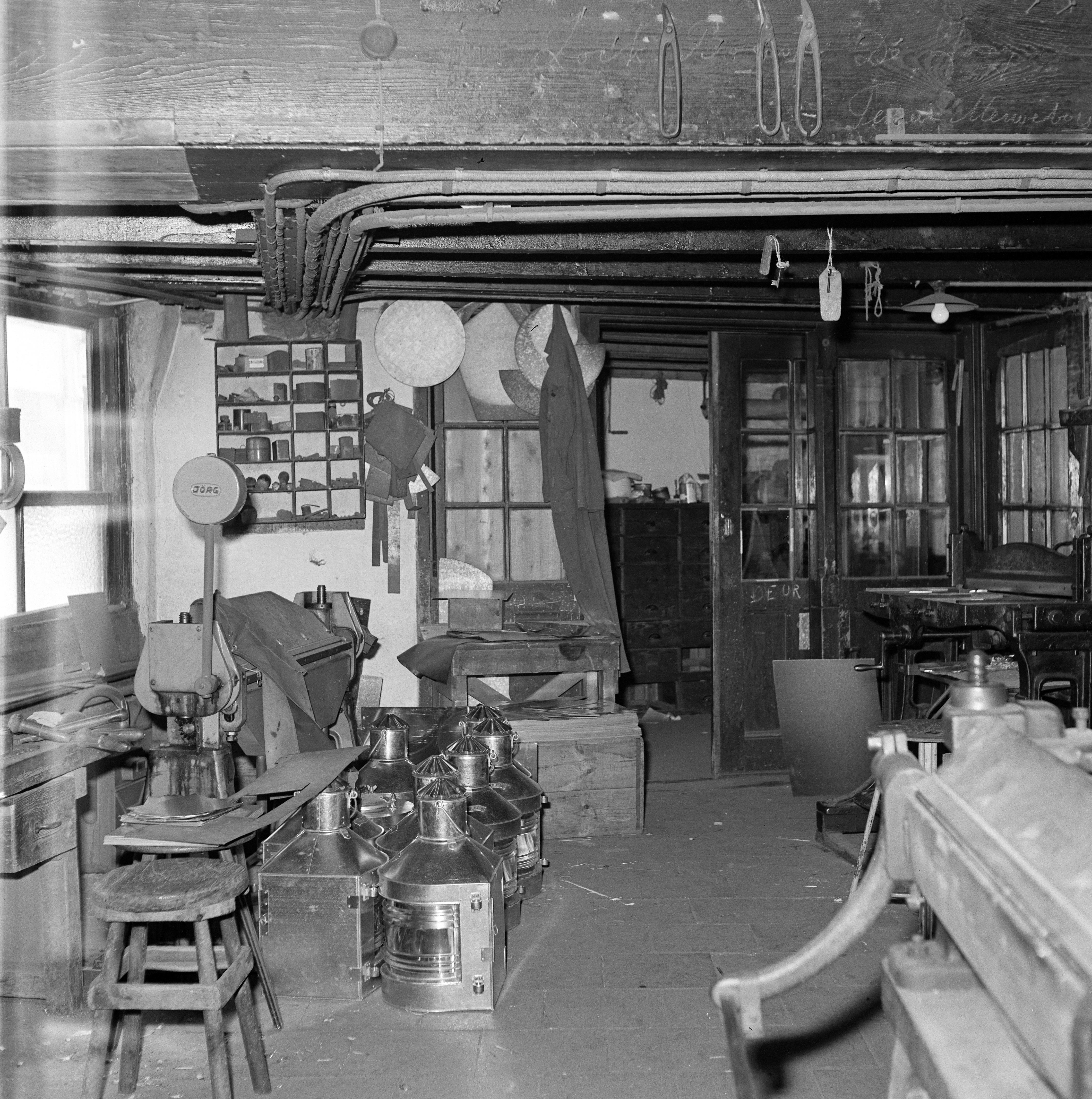 Interieur van koper- en blikslagerij Zock aan de Bleijenhoek.