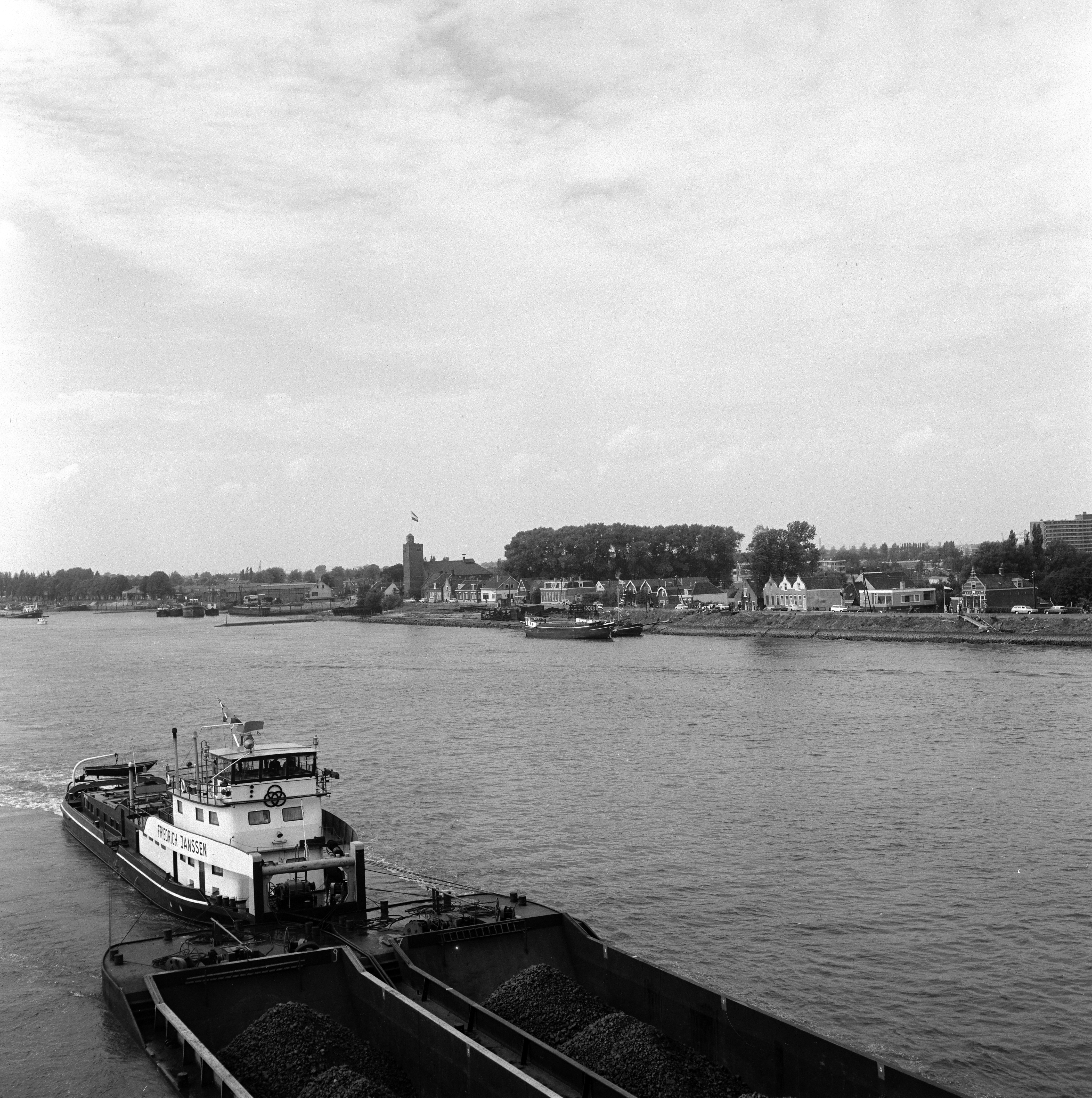 De Merwede vanaf de Merwedebrug naar het westen gezien. In het midden de Hervormde Kerk …