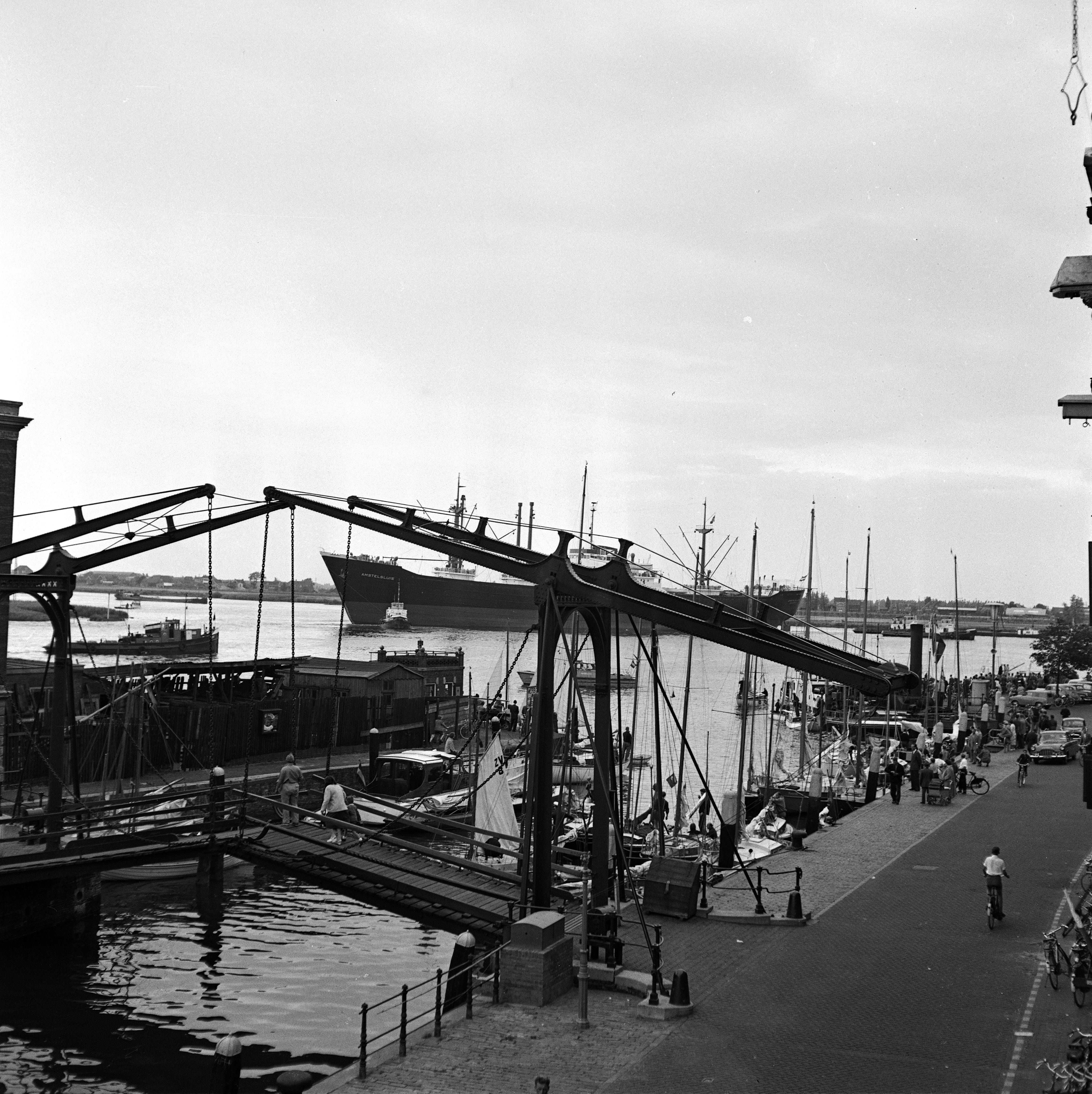 - De Damiatebrug over de Wolwevershaven vanaf de Kuipershaven (rechts) naar het Damiatebolwerk.