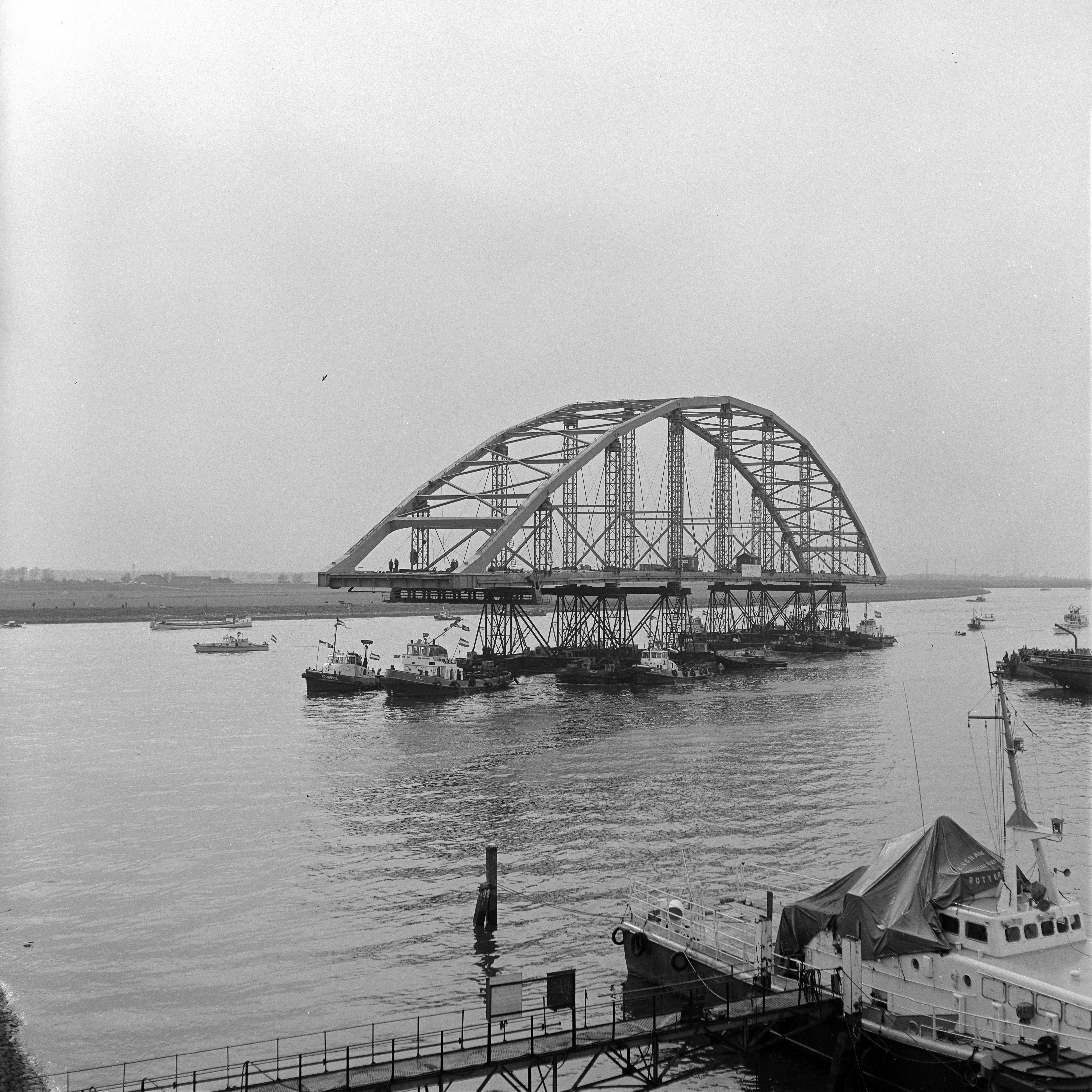 De "Papendrechtse brug" die gebouwd werd bij Penn & Bauduin in Dordrecht-West moest een flinke omweg maken om op de plaats van bestemming te komen. De brug werd ingevaren in 1967. Links op de foto een mastje te zien van het kleine 50 kV-lijntje Zwijndrecht - Slikkerveer.