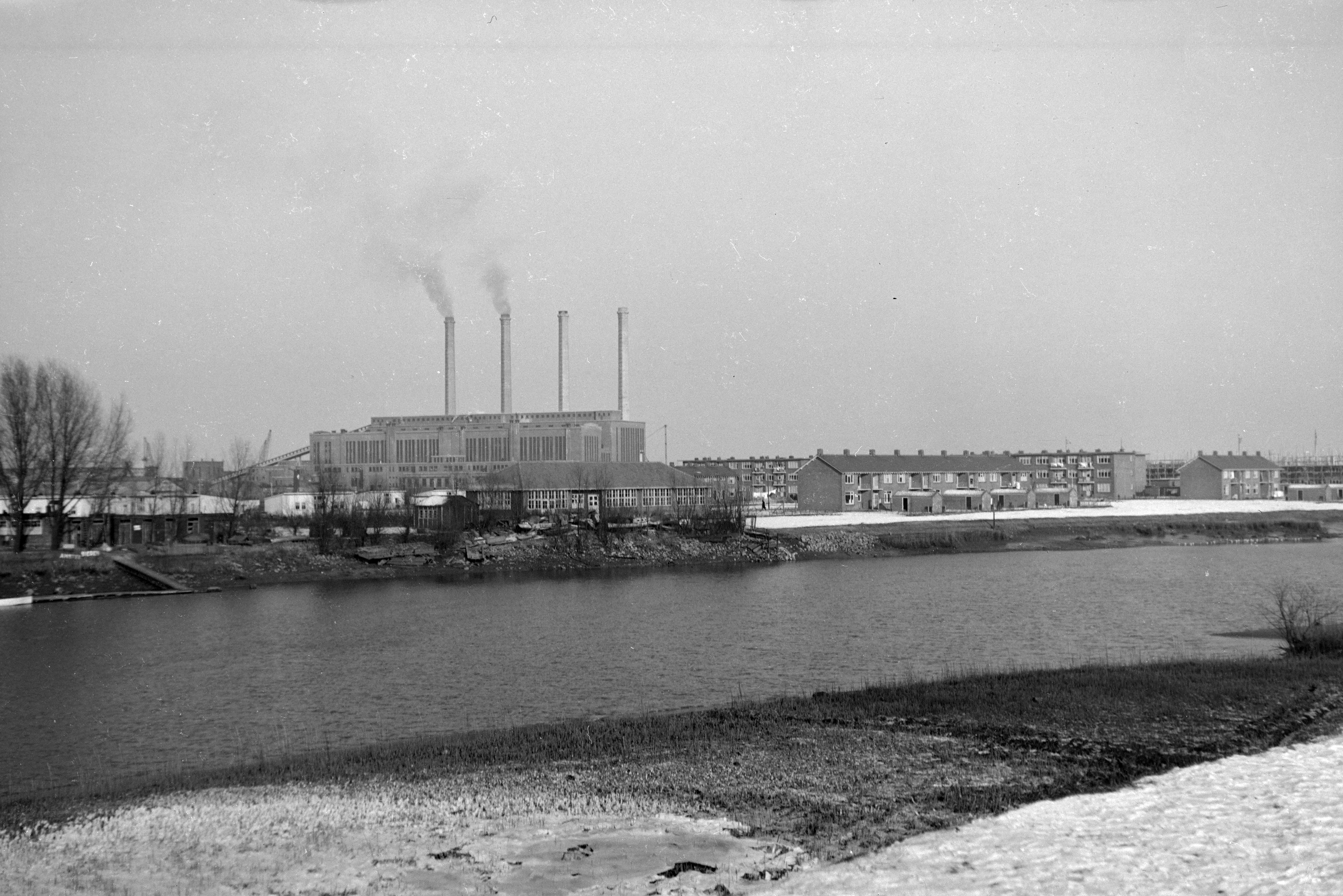 Maasstraat en Beekmanstraat langs het Wantij. De Merwedecentrale op de achtergrond.