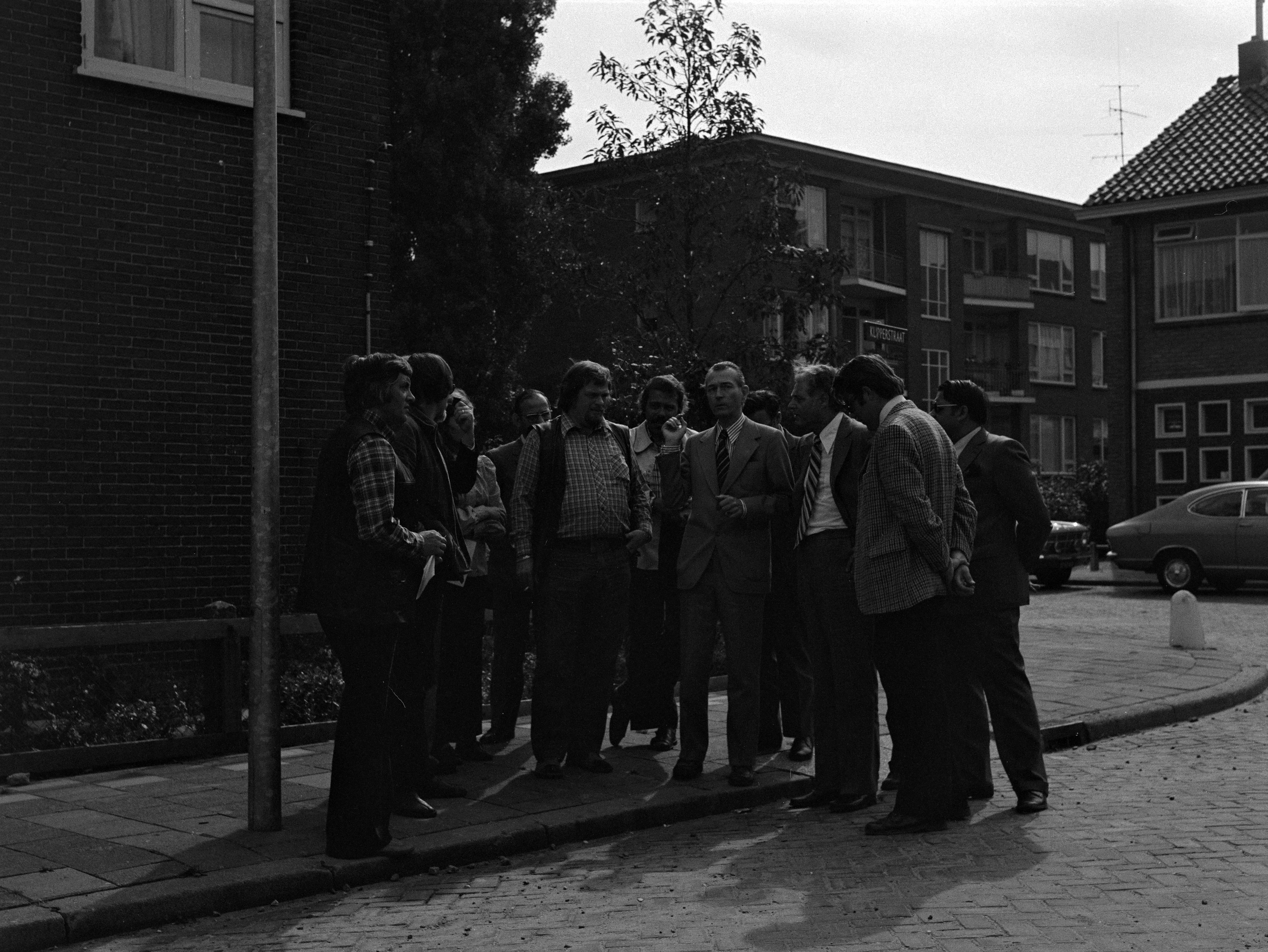 - Bezoek van staatssecretaris Jan Schaefer (midden, in geruit overhemd) van het Ministerie van Volkshuisvesting en Ruimtelijke Ordening bij de hoek Kotterstraat/Klipperstraat. Derde van rechts is burgemeester Van Zuuren.