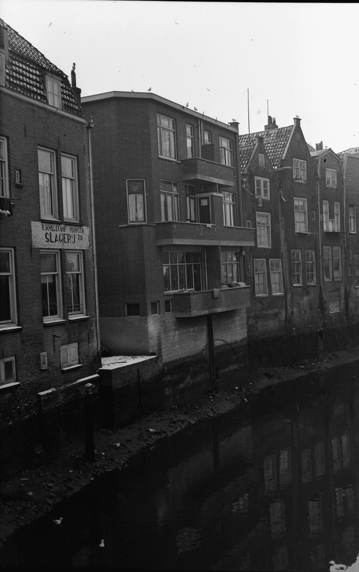 - Laagwater in de Voorstraatshaven, gezien vanaf de Lombardbrug. Tussen de achterkant van huizen in de Voorstraat ligt de Grote Spuisteiger.