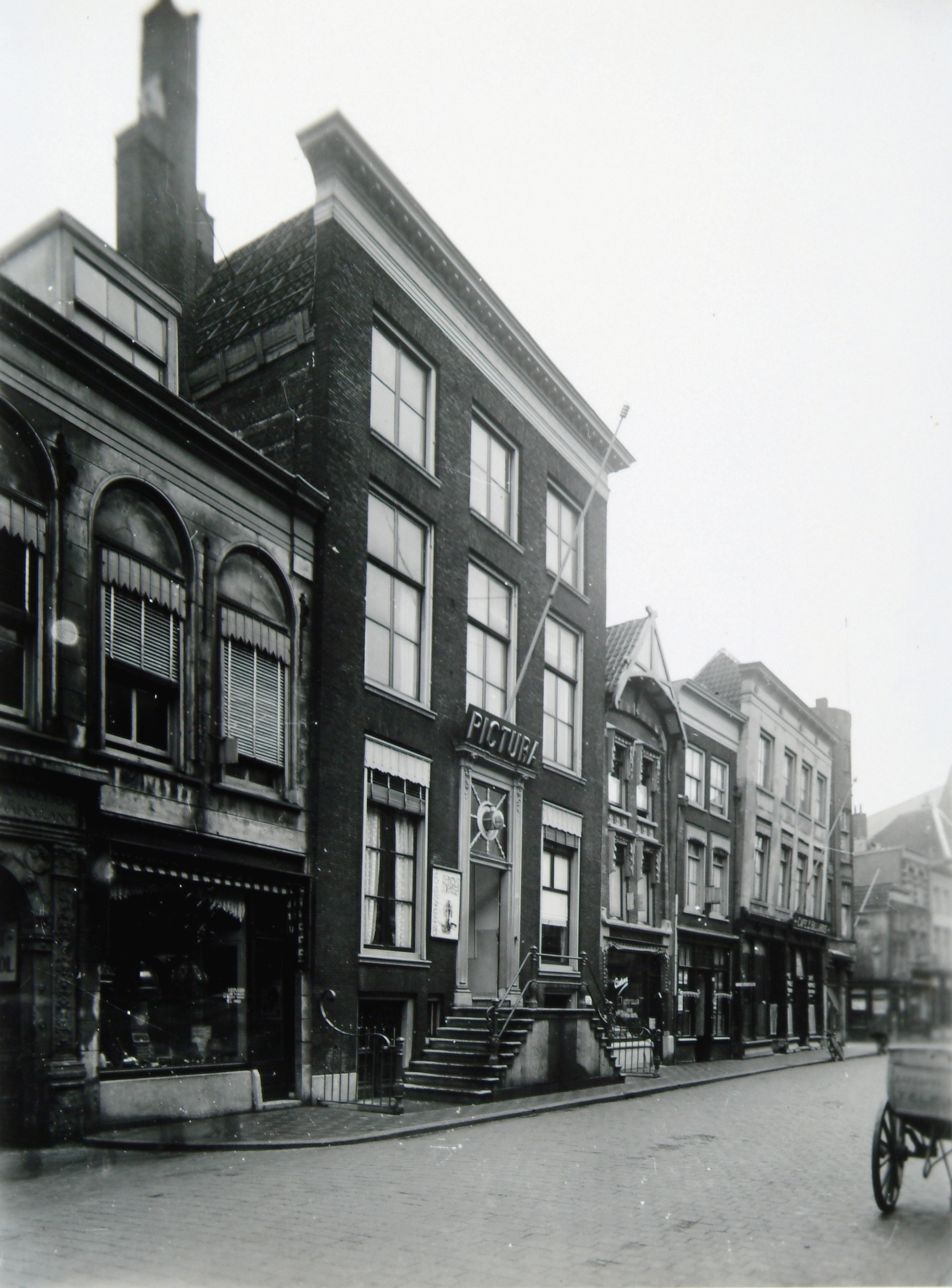 - De Voorstraat tussen Zakkendragersstraat en Steegoversloot. Geheel links is nog net de Muntpoort te zien, in het midden gebouw Pictura.