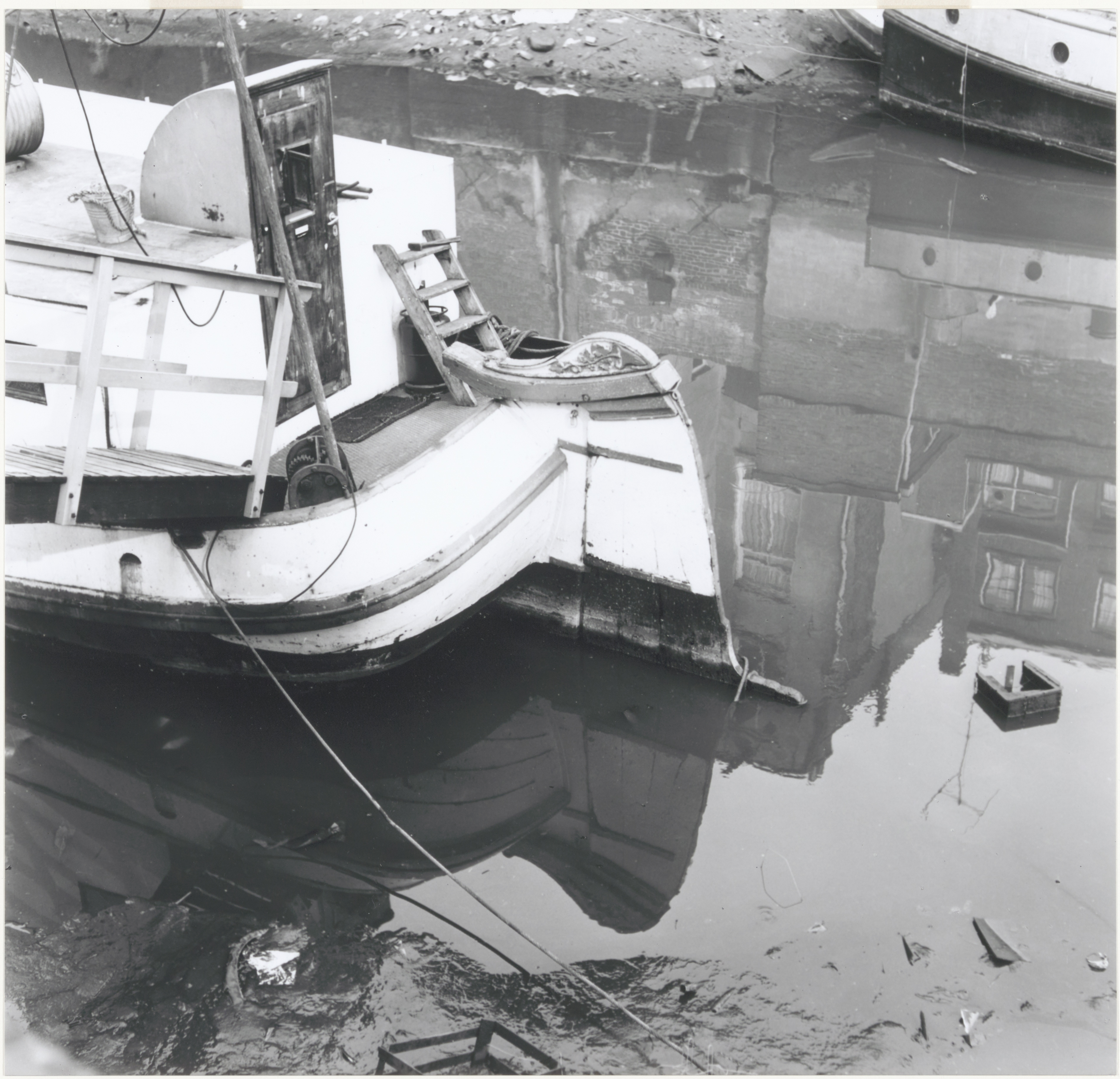 Laagwater in de Wijnhaven, gezien vanaf de Botermarkt met weerspiegeling van panden aan …