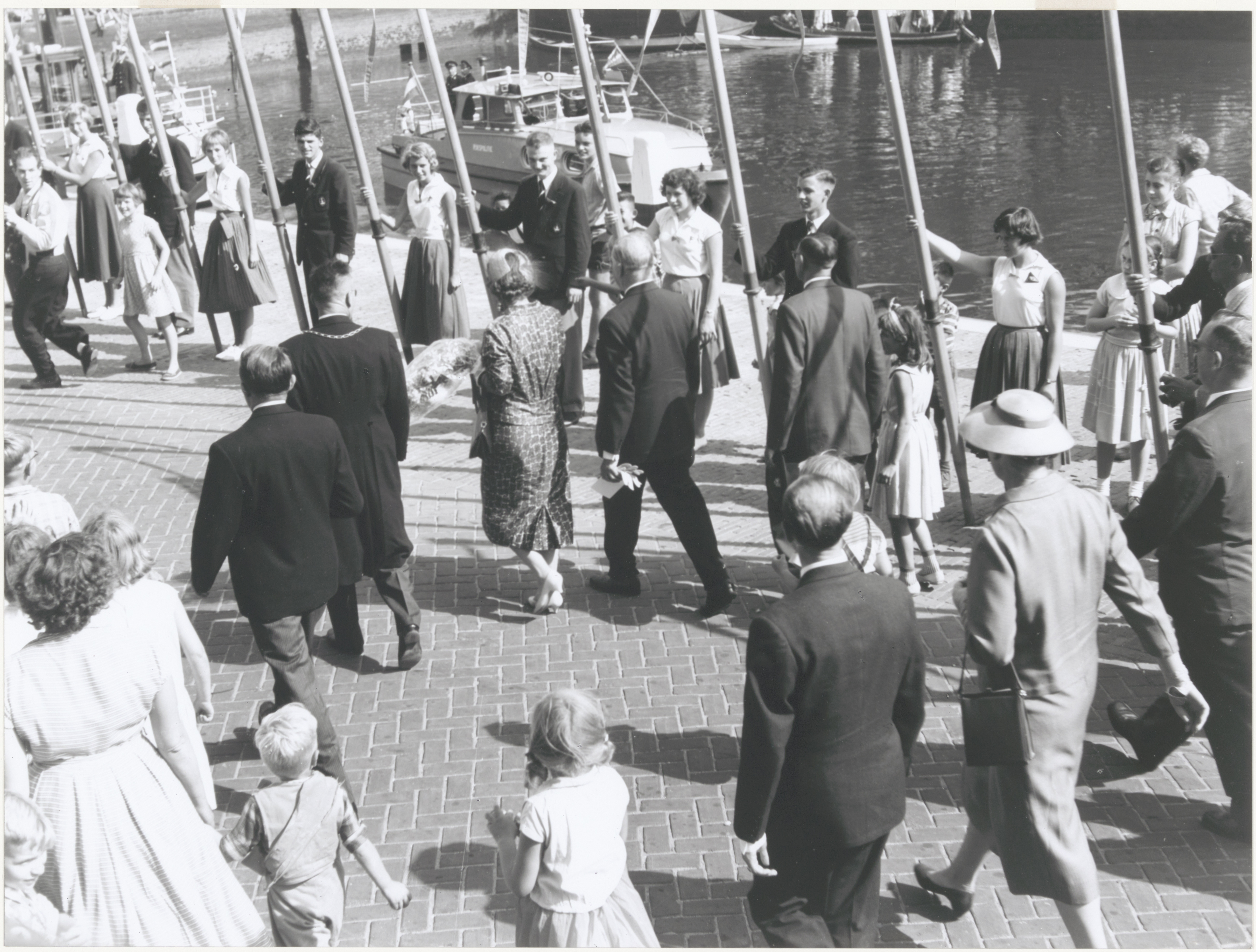 Koningin Juliana en burgemeester Van der Dussen op de Nieuwe Haven t.g.v. de opening …
