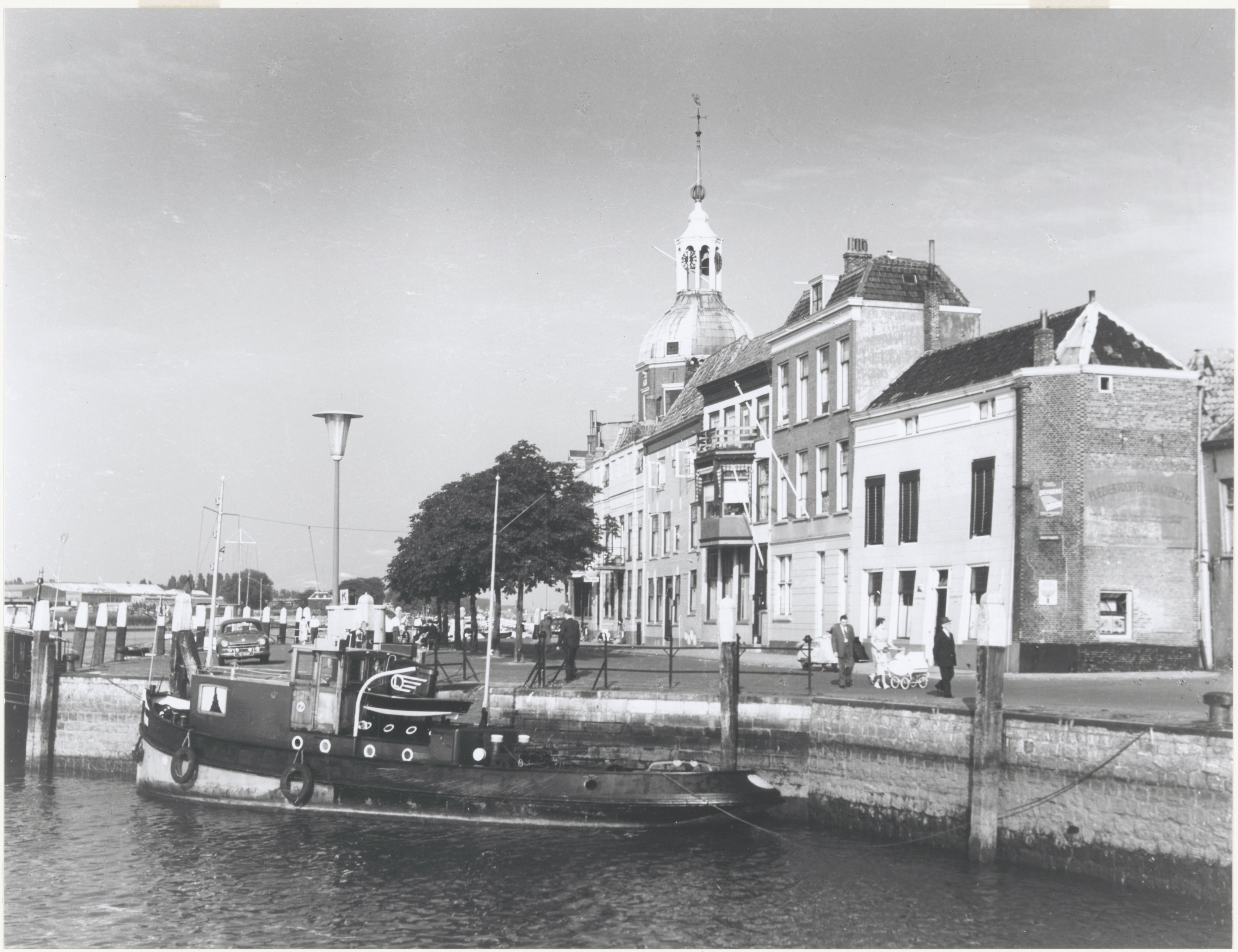 - Sleepboot aan het Groothoofd in de monding van de Wolwevershaven. In het midden de Groothoofdspoort.