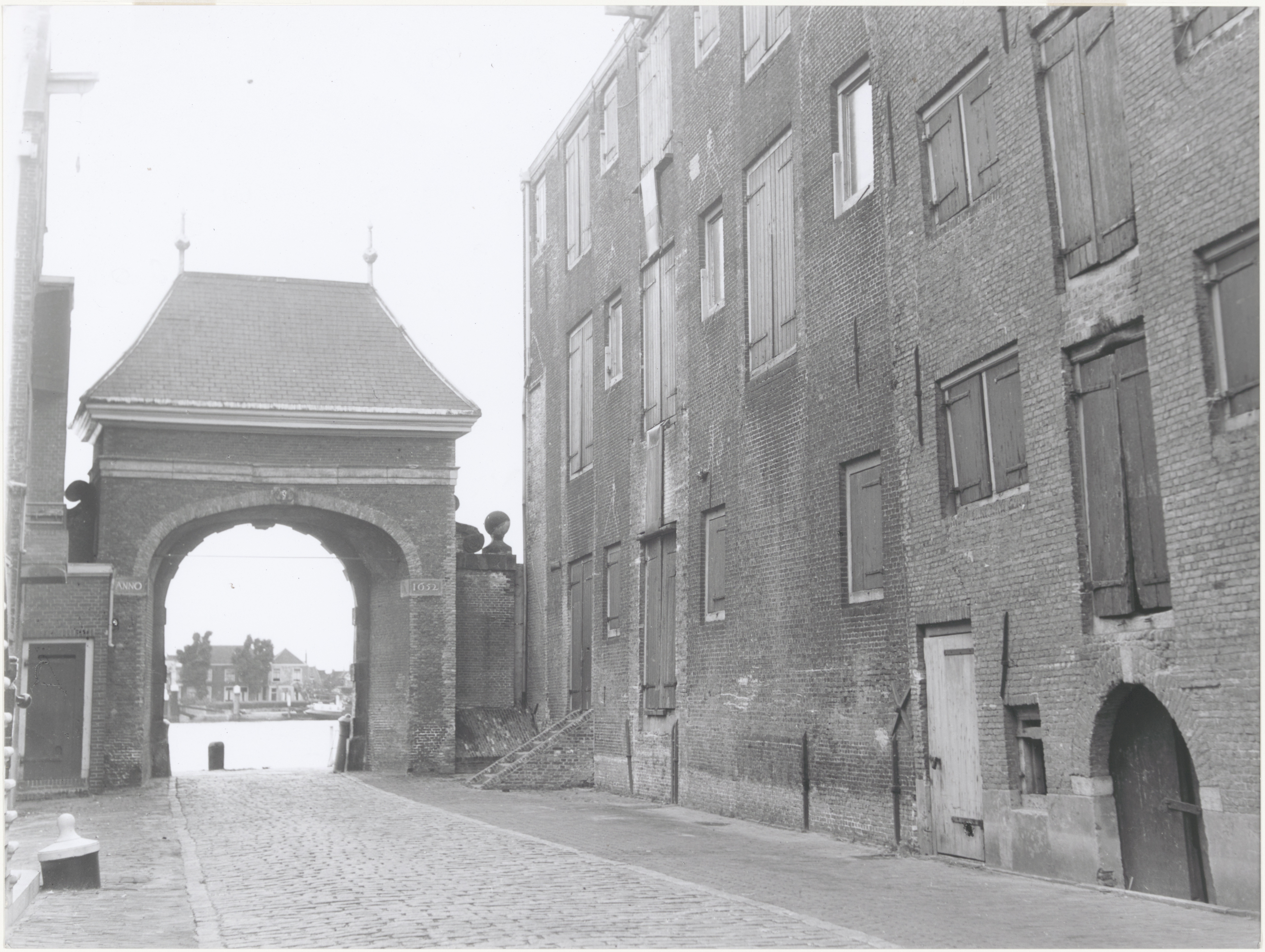 Korte Engelenburgerkade met de pakhuizen Engeland en Rusland. Door de Catrijnepoort …