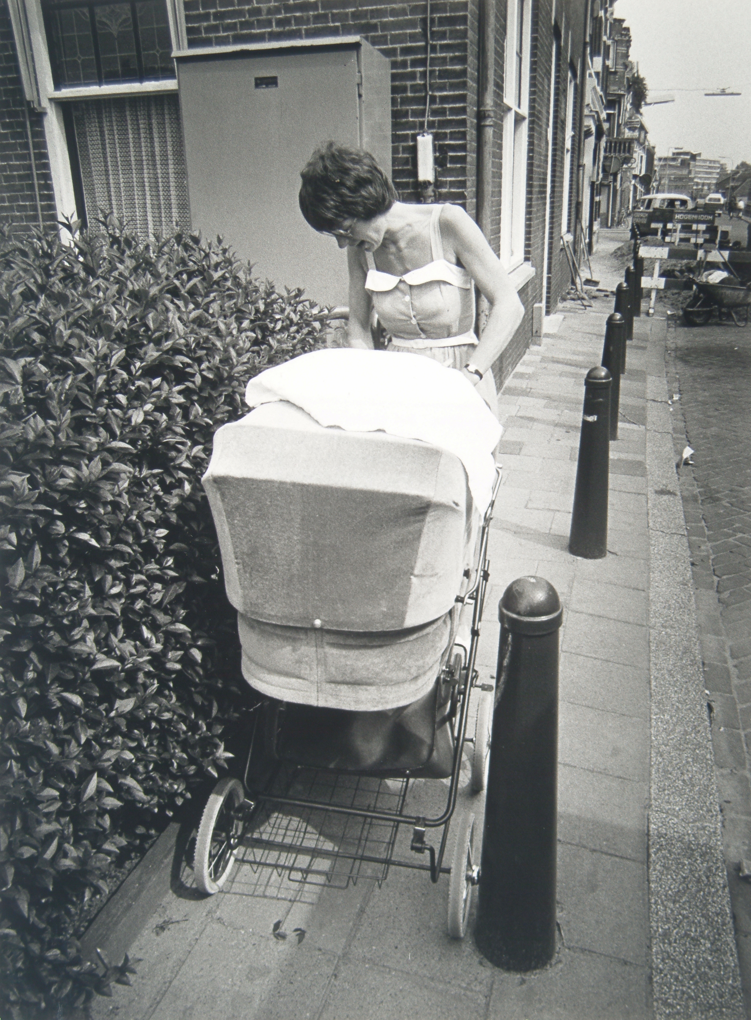 Moeder met kinderwagen wordt gehinderd door anti-parkeer-paaltjes op de Noordendijk